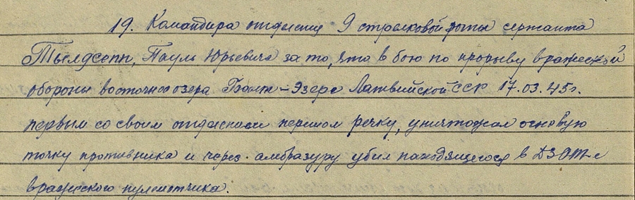 Nädalavahetusel saadud Vapruse medal nr. 2353125, kavaleriks jutu järgi Tõldsepp ja et medali sai Kuramaal. Numbri järgi on see kindlasti Kuramaal saadud medal, selles ma ei kahelnud ja ka seal medali saanud seersant Tõldsepp on täiesti olemas. Kui õieti aru saan siis jaoülem. Märtsis 1945 ületas koos oma jaoga esimesena jõe, hävitas vaenlase tulepunkti, ning läbi ambrasuuri likvideeris dzotis olnud vaenlase kuulipilduri.