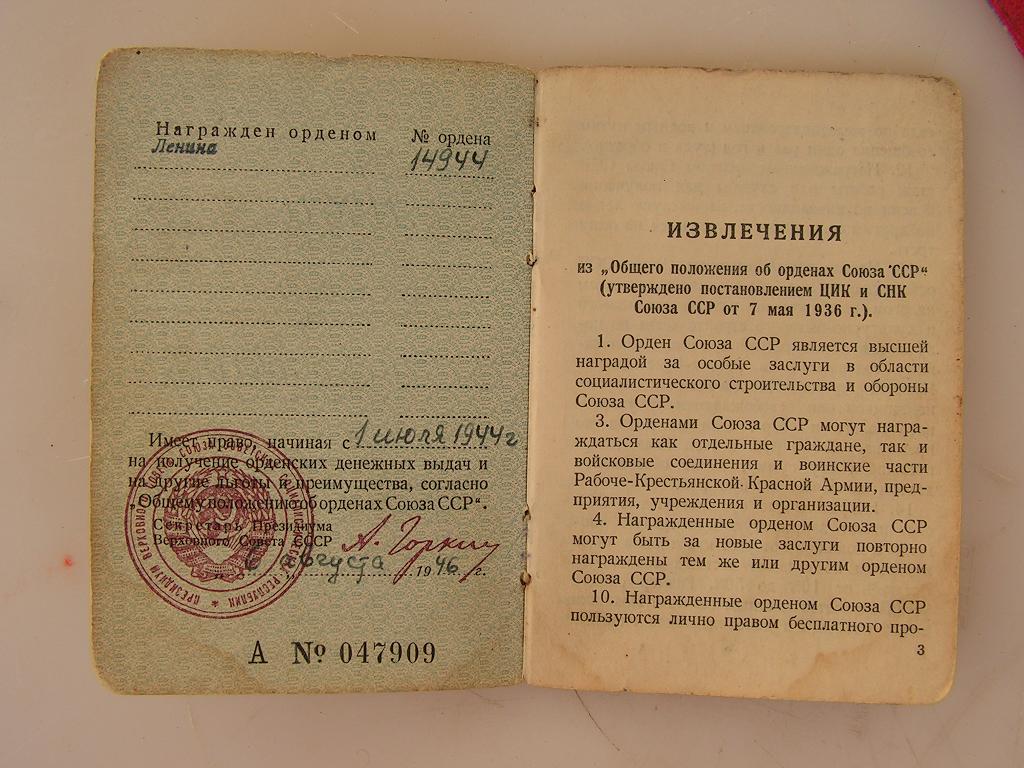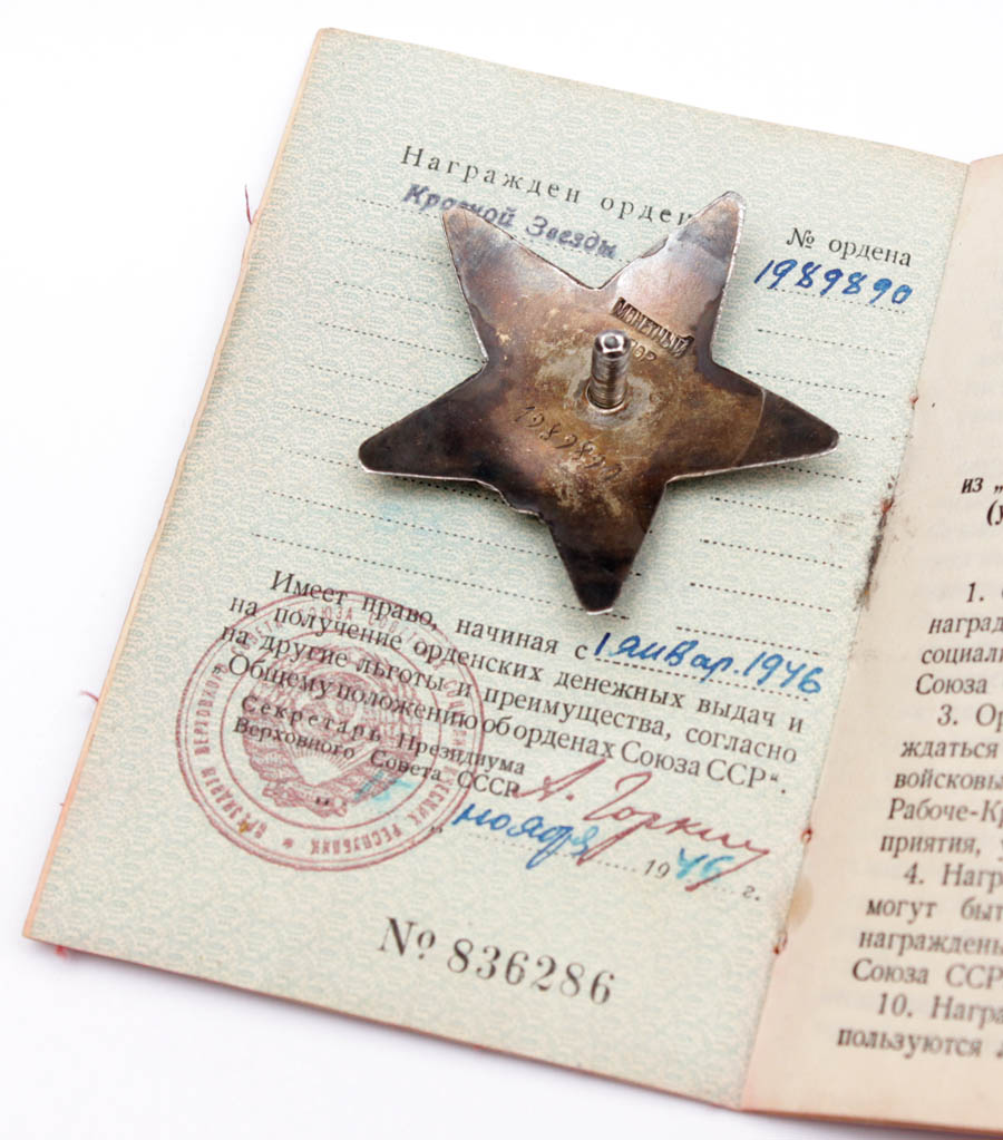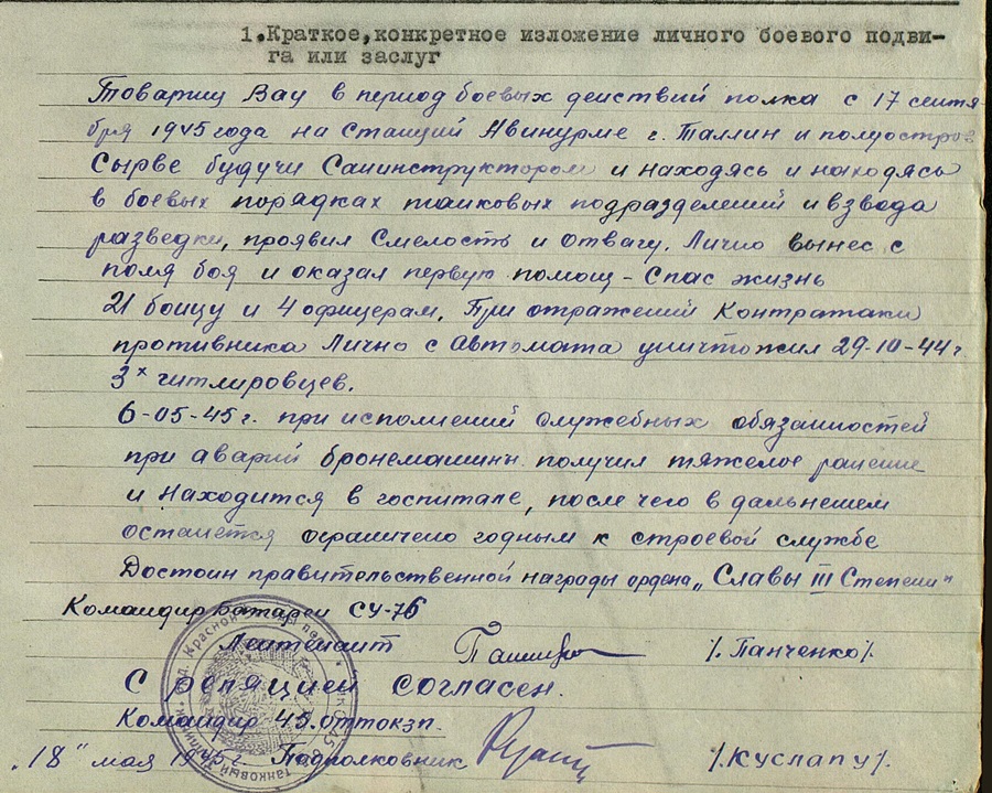 Ja veel korpuse 46. Üksiku tankipolgu san.instruktor starshina Vau. Punatähe 1 190 943 kavaler. Vau on varem saanud ka Vapruse medali, kuid see on kahjuks kadunud, nagu ka ordeni raamat. Küll on aga alles Võit Saksamaa üle medali dokument ja ordeniraamatu juurde kuulunud sõidupiletid. Just täpselt nii on nad koos saadud.