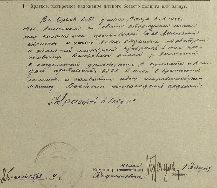 Korra veel sellest Lembit Haljaste komplektist. Lõpuks õnnestus andmebaasist üles leida ka tema 2. järgu Isamaasõja ordeni autasuleht. Tuleb välja, et teda autasustati hoopis 1944. aasta Saaremaa lahingute eest, mitte seoses selle Kuramaal toimunud episoodiga, mis ma siia eelnevalt postitasin. Autasulehe järgi tegi Haljaste luuret sakslaste poolt purustatud Väikese väina tammil, kus ta määras kindlaks purustuste ulatuse ning deaktiveeris sakslaste paigaldatud miine. Seda kõike muidugi kõva kuulipilduja ja miinipilduja tule all. Algselt esitati ta selle teo eest lausa Punalipu ordeni saamiseks aga muudeti siis hiljem 2. järgu Isamaasõja ordeniks.
