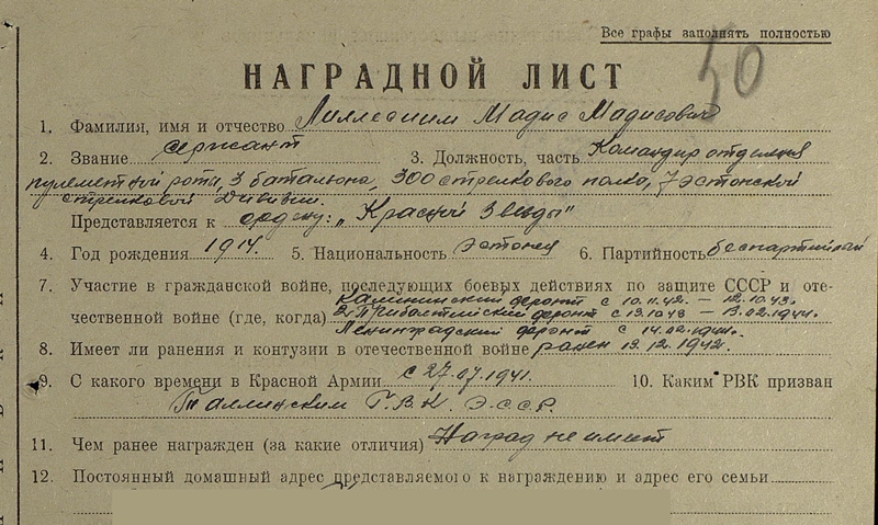 Kahjuks tuleb andmebaasist välja ainult 1985. aastal antud Isamaasõja II järgu orden. Punatähe autasulehte ei õnnestunud minul sealt leida ja seega on hetkel teadmata, kus allüksuses ta teenis ja mille eest ordeni sai.