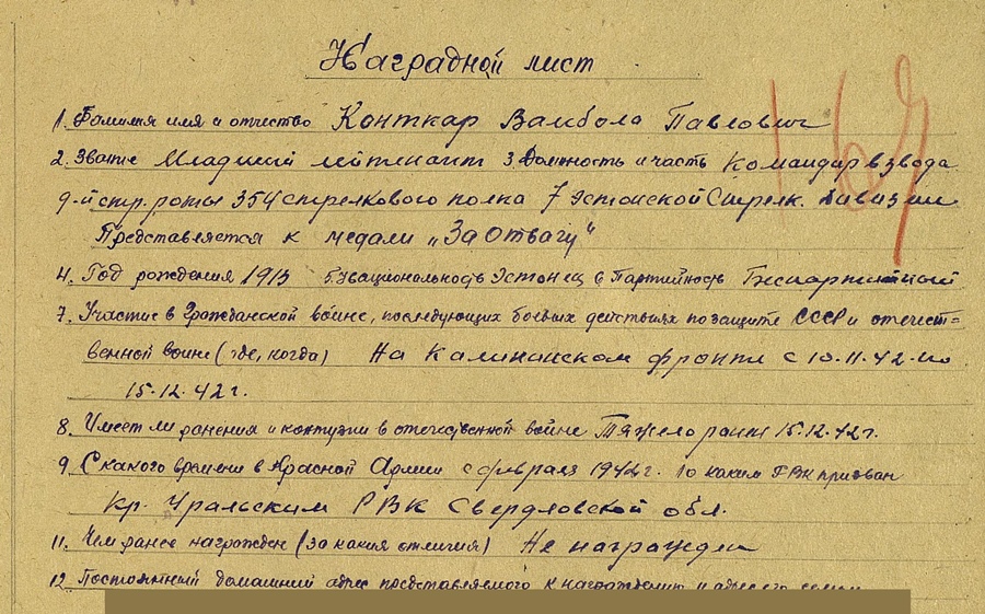 Tagadi laadalt kolihunnikust välja tiritud dokument medalile ''Võidu eest saksamaa üle''. 368. Eesti laskurpolgu templiga. Autasustatu - kaardiväeleitnant Vambola Kontkar. Sai Velikije Luki lahingutes haavata ja ka Vapruse medali.