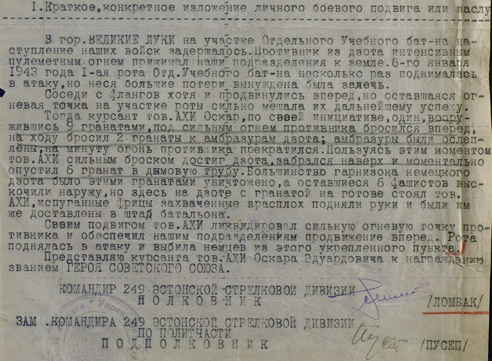 Oskar Ahi – Suure Isamaasõja ajal Lenini ordeniga autasustatud 249. laskurdiviisi üksiku õppepataljoni kursant. Esitati Luki all tehtud tegude eest Nõukogude Liidu kangelase kuldtähe saamiseks, aga sai Lenini ordeni ( mis on küll kahjuks kadunud... vist ). Üks vähestest eestlastest ( kui mitte ainuke ), kes ei olnud ohvitser ja keda sõja ajal konkreetse vapra teo või tegude eest Lenini ordeniga autasustati.