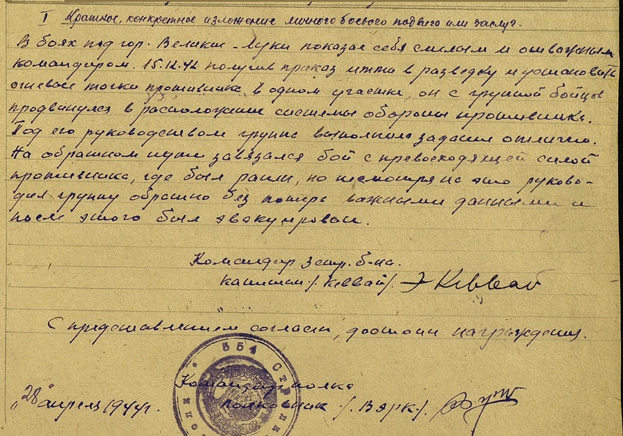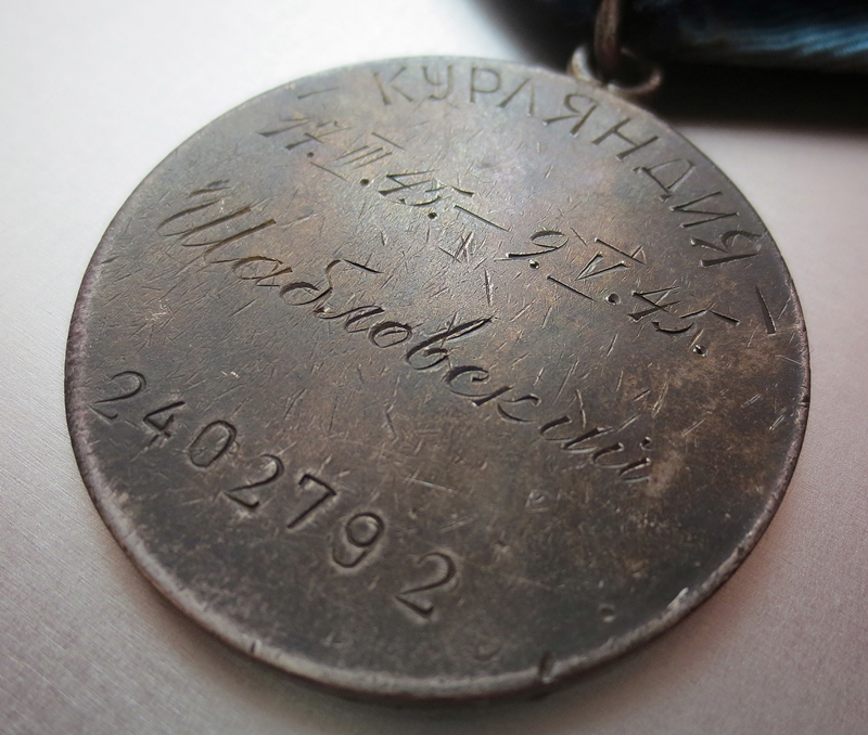 Ja tänane leid Vapruse medali näol. Seerianumbrit vaadates tundus graveering Kuramaa medali reversil tõele vastavat ja tõesti, leidsingi medalil oleva nime järgi otsides omaniku andmebaasist ülesse. Reamees Mihhail Shablovski oli 7. Eesti Punalipulise Laskurdiviisi 118. Üksiku sidepataljoni staabiroodu telefonist. Tagas vaenlase tugeva tule all sideliine korras hoides mitmel korral katkematu side, mille eest saigi autasustatud Vapruse medaliga.