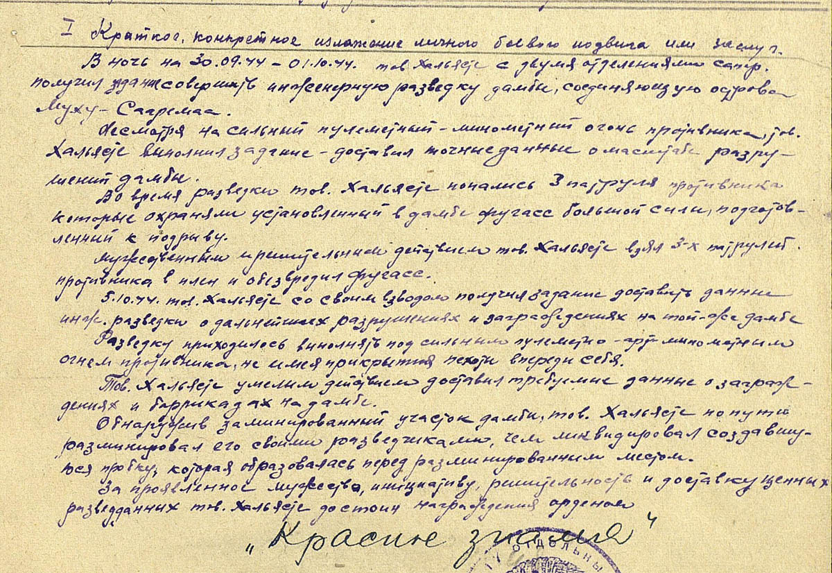 Korra veel sellest Lembit Haljaste komplektist. Lõpuks õnnestus andmebaasist üles leida ka tema 2. järgu Isamaasõja ordeni autasuleht. Tuleb välja, et teda autasustati hoopis 1944. aasta Saaremaa lahingute eest, mitte seoses selle Kuramaal toimunud episoodiga, mis ma siia eelnevalt postitasin. Autasulehe järgi tegi Haljaste luuret sakslaste poolt purustatud Väikese väina tammil, kus ta määras kindlaks purustuste ulatuse ning deaktiveeris sakslaste paigaldatud miine. Seda kõike muidugi kõva kuulipilduja ja miinipilduja tule all. Algselt esitati ta selle teo eest lausa Punalipu ordeni saamiseks aga muudeti siis hiljem 2. järgu Isamaasõja ordeniks.