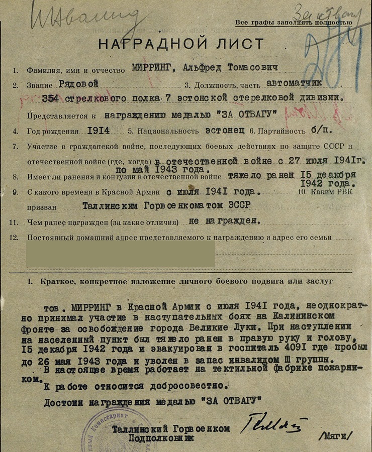 Alfred Mirring 354. Laskurpolgu automaatur. Sai Velikije Luki lahingutes raskelt haavata. Vapruse medali (3356154) kavaler, medaliga autasustamiseks esitati ta 1945 aastal.