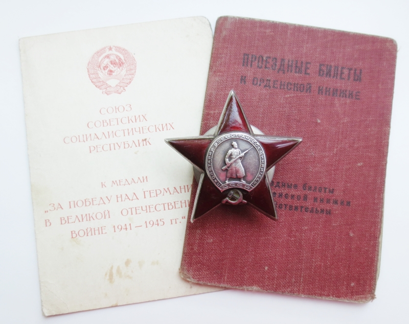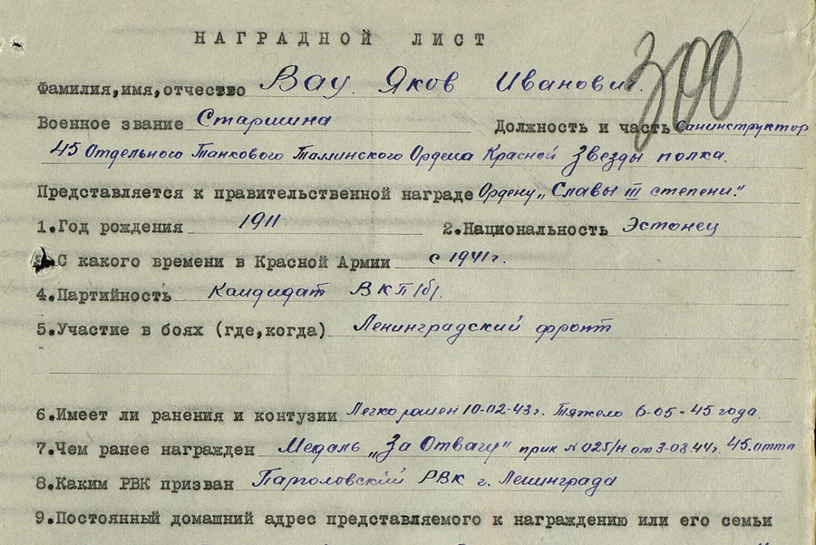 Ja veel korpuse 46. Üksiku tankipolgu san.instruktor starshina Vau. Punatähe 1 190 943 kavaler. Vau on varem saanud ka Vapruse medali, kuid see on kahjuks kadunud, nagu ka ordeni raamat. Küll on aga alles Võit Saksamaa üle medali dokument ja ordeniraamatu juurde kuulunud sõidupiletid. Just täpselt nii on nad koos saadud.