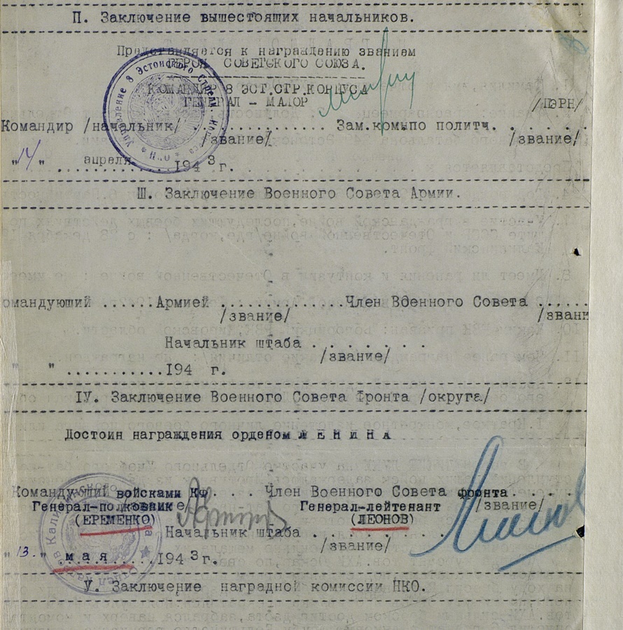 Tagadi laadalt kolihunnikust välja tiritud dokument medalile ''Võidu eest saksamaa üle''. 368. Eesti laskurpolgu templiga. Autasustatu - kaardiväeleitnant Vambola Kontkar. Sai Velikije Luki lahingutes haavata ja ka Vapruse medali.