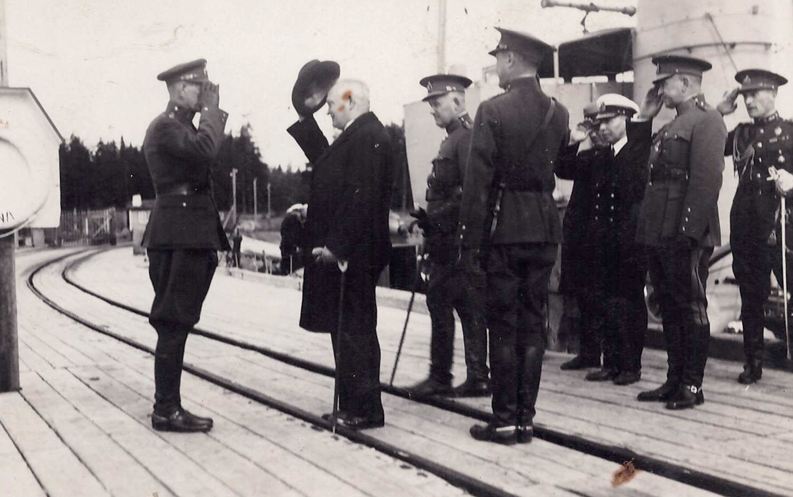 Esimesel pildil vasakult paremale - 2. Konstantin Päts, 3. Johan Laidoner, 6. Valentin Grenz, 7. Paul Lill ja 8. presidendi käsundusohvitser Herbert Grabbi. Teisel pildil külastab sadamas vastu võetud seltskond Rannapatarei nr. 3 meeskonda. Laidoneri selja taga paistab Valentin Grenzi portfelli hoidev käsi ja käe taga seisab Rannapatarei Nr. 3 ülem Konstantin Johannes Tingas. Kolmandal pildil sama seltskond mingit kaarti uurimas.