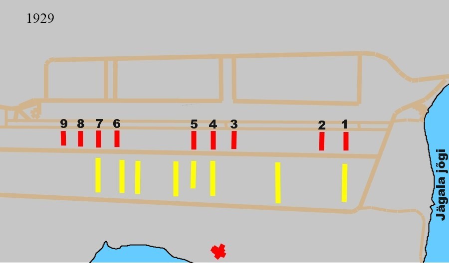Punasega märgitud sõdurite barakid, ehk kasarmud.
