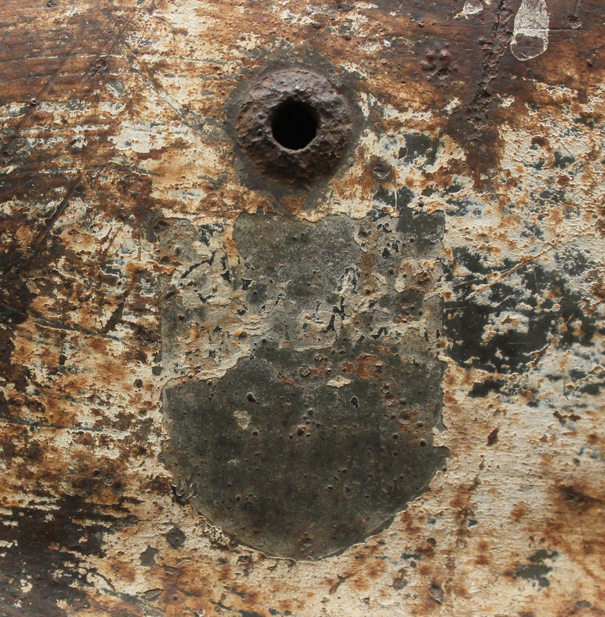 Kiivril on läbiv kuuliauk ja pealagi on lõhki. Tahaks kuulda arvamusi nende mõrade kohta - kas tegemist on mürsukillust tingitud vigastustega või on pigem on kahjustused tekitanud kiivris jäätunud vesi? Vasakul küljel on näha jälgi WH dekaalist ja sisemisel võrul on 1938. aasta markeeringud.