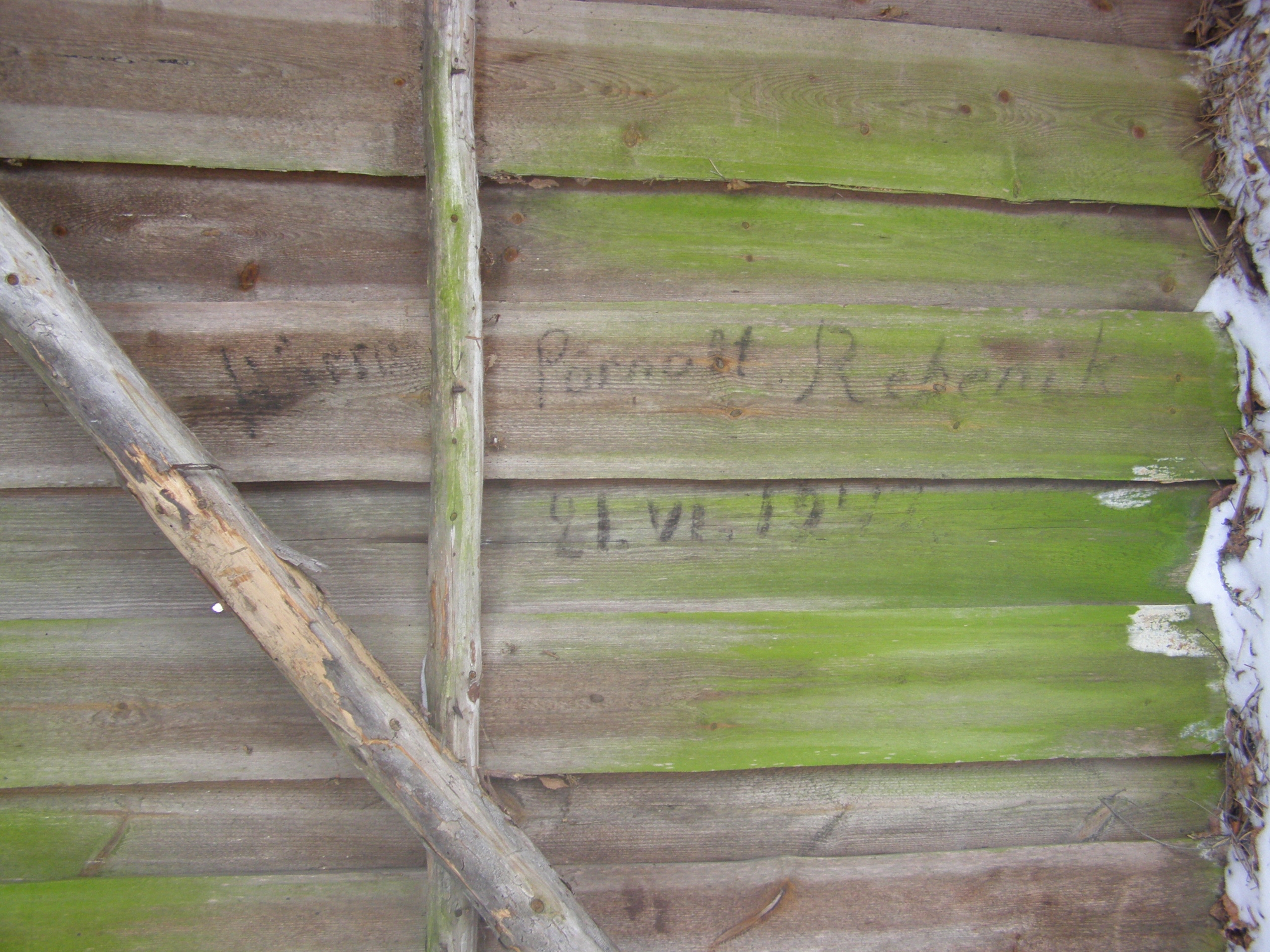 Alutaguse metsast üks vana küün. Jäädvustatud sisemisel küljel söetükiga 1947. Kas on metsavendade jäetud?