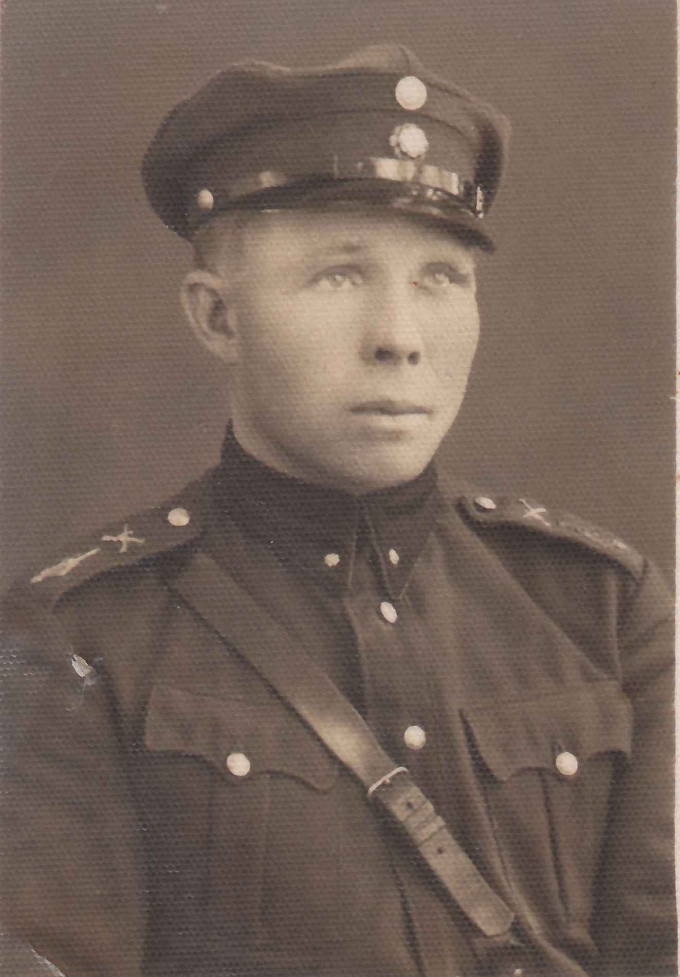 Kaitseliidu vorm 1935. aastast (1935-1940). Kokardi ja pagunimärkide järgi saab öelda, et kuulus Kaitseliidu Järva malevasse ja teenis rühmapealiku ametikohal. Pagunitel näha olevad ristatud Madsen kuulipilduja ja vintpüss tähendab kuulumist jalaväe allüksusesse, samas vormikuue krae ja pagunite ning vormimütsi värvipael tunduvad fotol liiga tumedad, et olla kollane (jalaväe tunnusvärv).IsaJaan kirjutas:Kas keegi oskab tuvastada vormi eraldusmärgid? Olen tänulik!