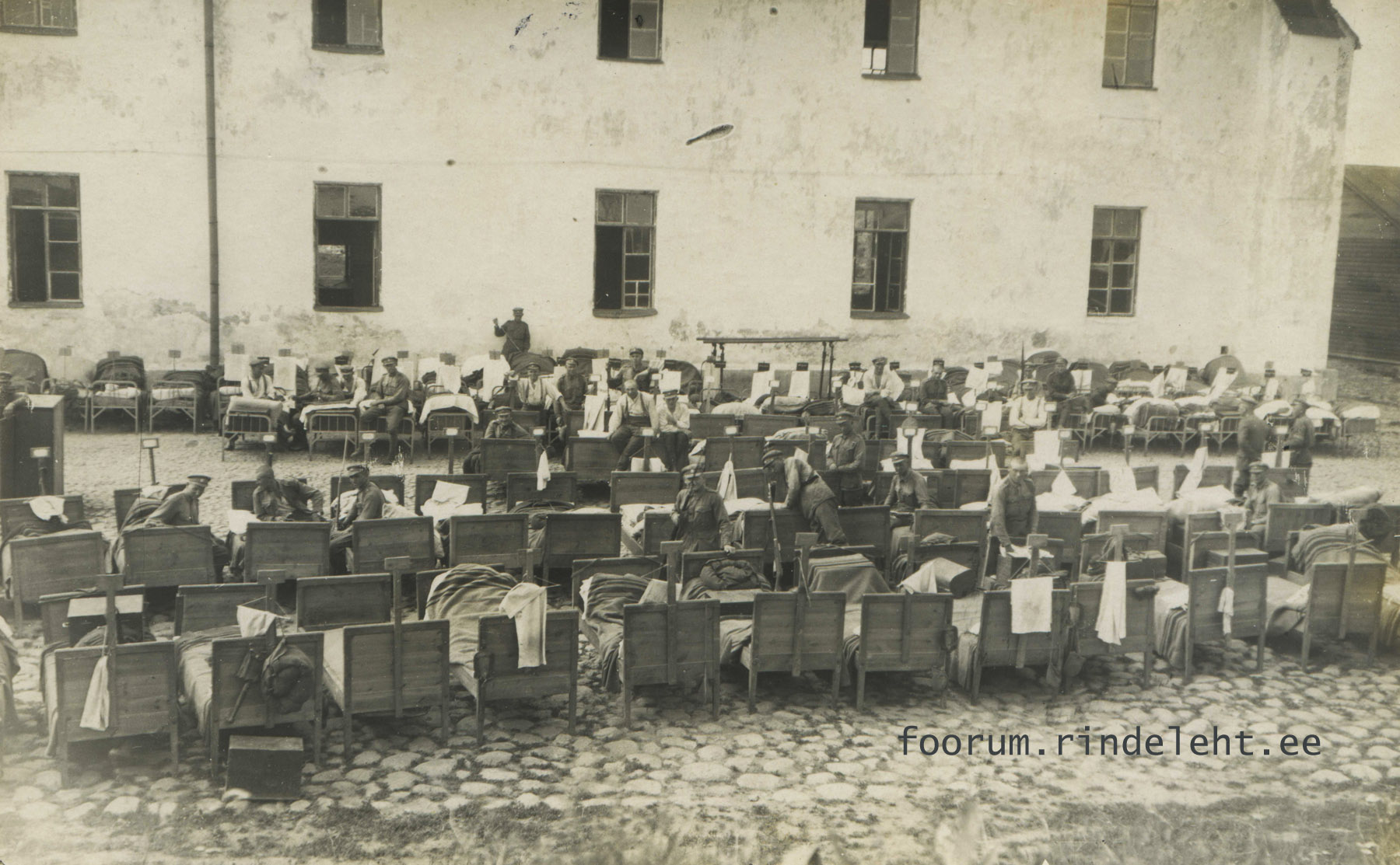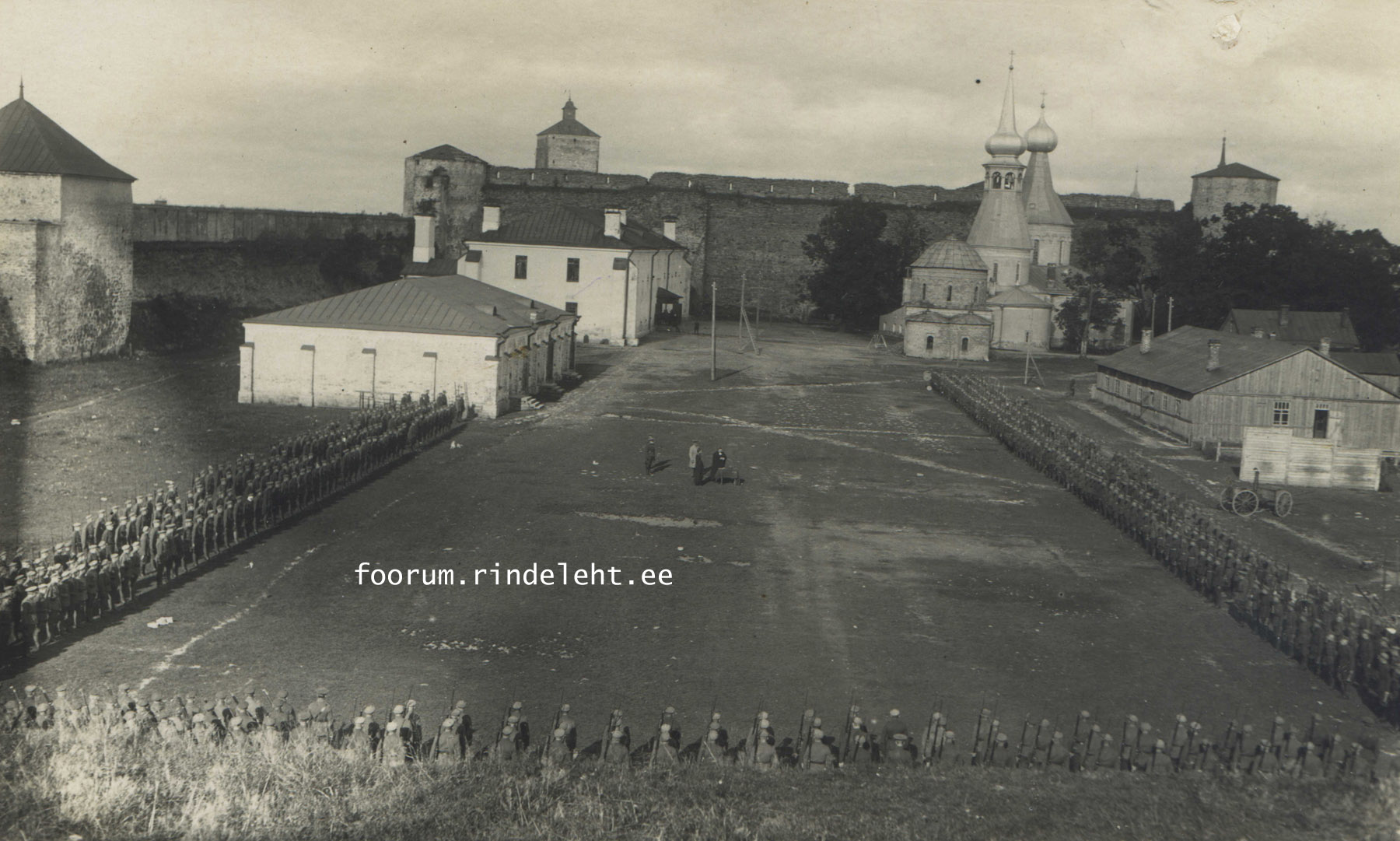 1920. aastate alguse ülesvõte Jaanilinna kindluse hoovist ja ülesrivistatud 1. Jalaväepolgu sõduritest.