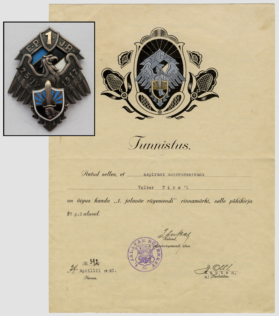 1. Jalaväerügemendi rinnamärk ja rinnamärgi tunnistus.
