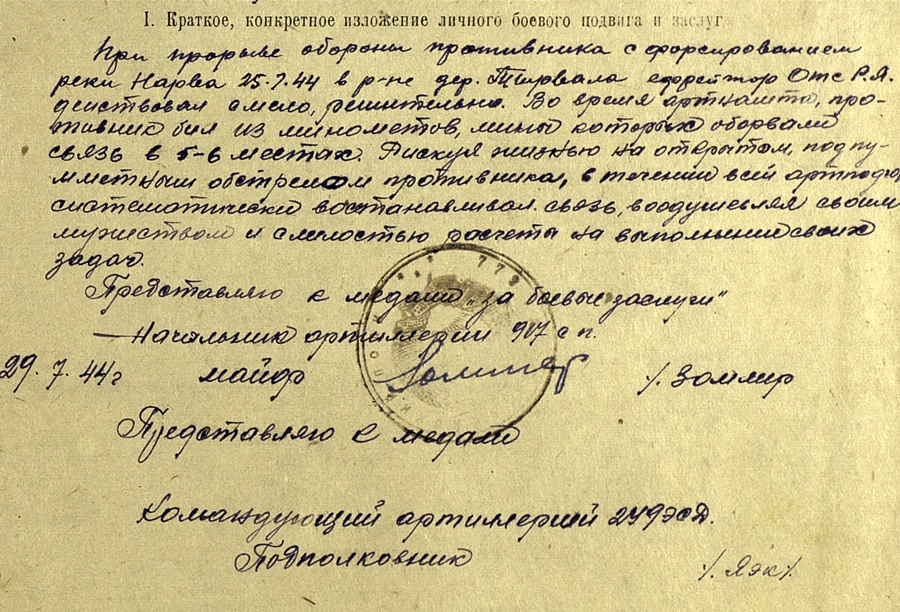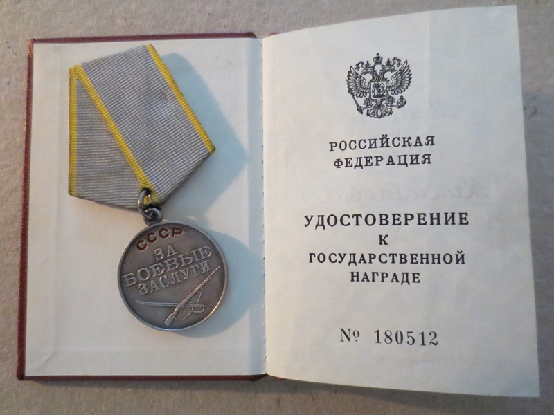 Lahinguteenete medal saadud Narva jõe pealetungilahingutes, kus parandas vaenlase tugeva tule all sideliine ja tagas katkematu side.