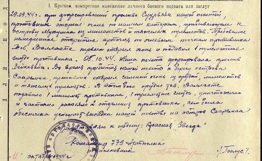 Laskurkorpuse suurtükiväelase Aksel Vallaste autasud. Kahjuks on ordeniraamat kadunud ja alles vaid hiline sõjaväepilet, kuid autasud on tema omad. Kuulsuse III klassi ordeni number on 464 970. Punatäht on saadud Suure ja Väikese väina forsseerimisel tehtud vaprate tegude eest, Kuulsuse orden on saadud Kalmani küla lahingutes Läti NSV-s.