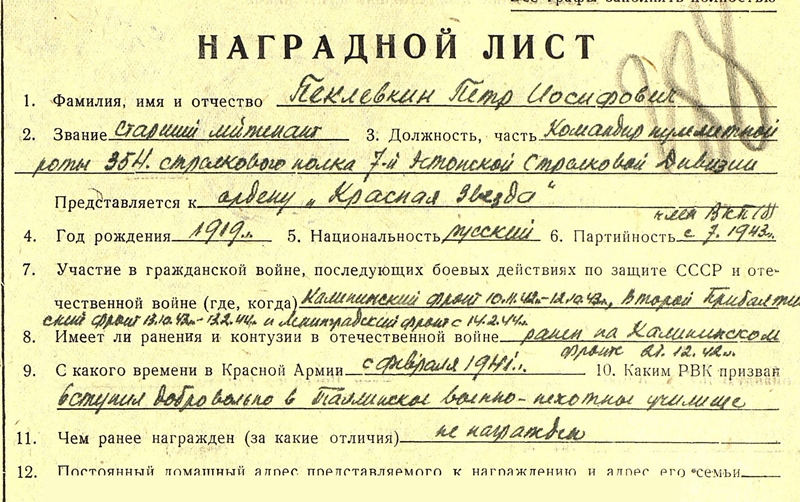 Eesti Laskurkorpuse 373. Laskurpolgu kuulipildujaroodu komandöri Peeter Peklevkin. Sai Punatähe ordeni ja seda Emajõe forsseerimisel, kus väikese grupi oma pataljoni võitlejatega ületas Emajõe, tappis isiklikult 4 sakslast, lõikasid ära tee ja hävitasid 2 vaenlase veokit.