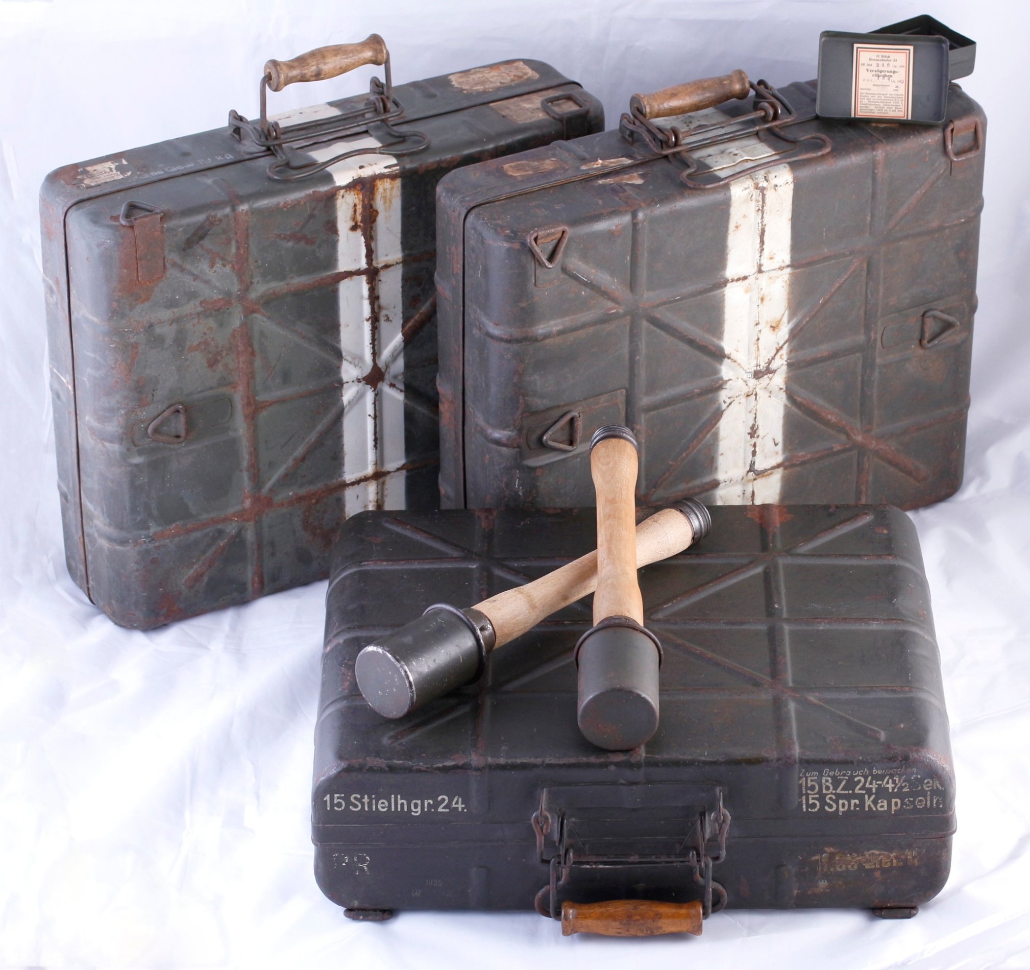 Kaigasgranaatide kohvrid - valge triibuga kohvrites hoiti udugranaate (Nebelhandgranate 39) ja ilma triibuta kohvris ründegranaate (Stielhandgranate 24).