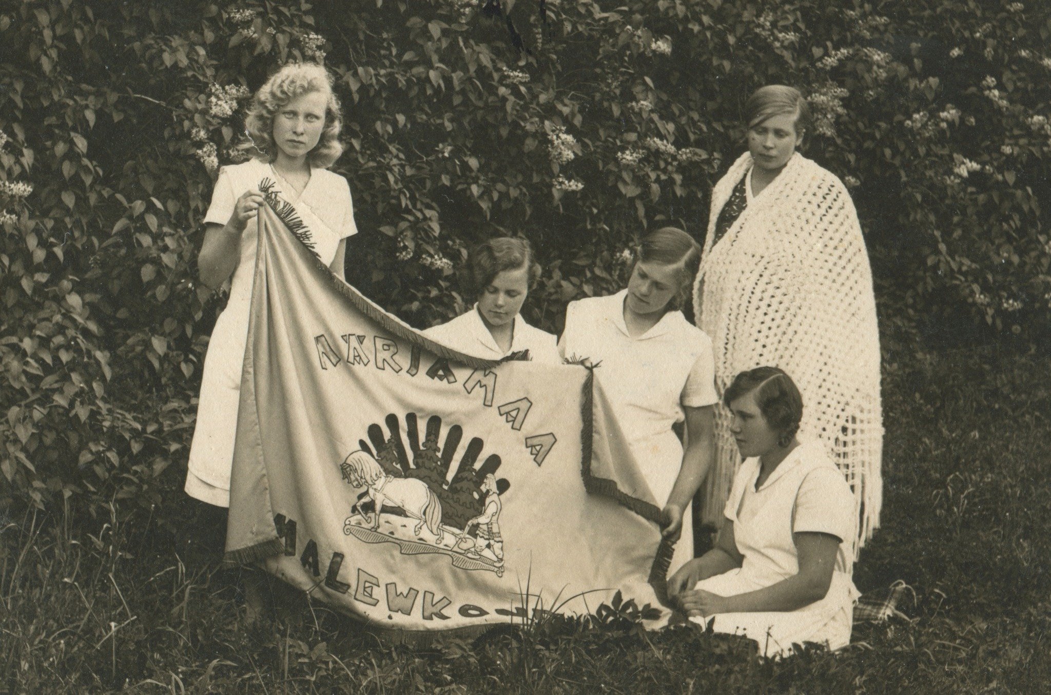 Kehtna Kodumajanduskooli näitsikud esitlevad Kaitseliidu Lääne maleva Märjamaa malevkonna lippu.