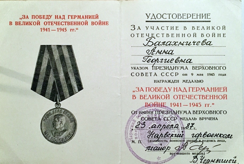 Ja siin ka üks Narva sõjakomissariaadi poolt välja antud Võidumedal Saksamaa üle tunnistus. 1987.