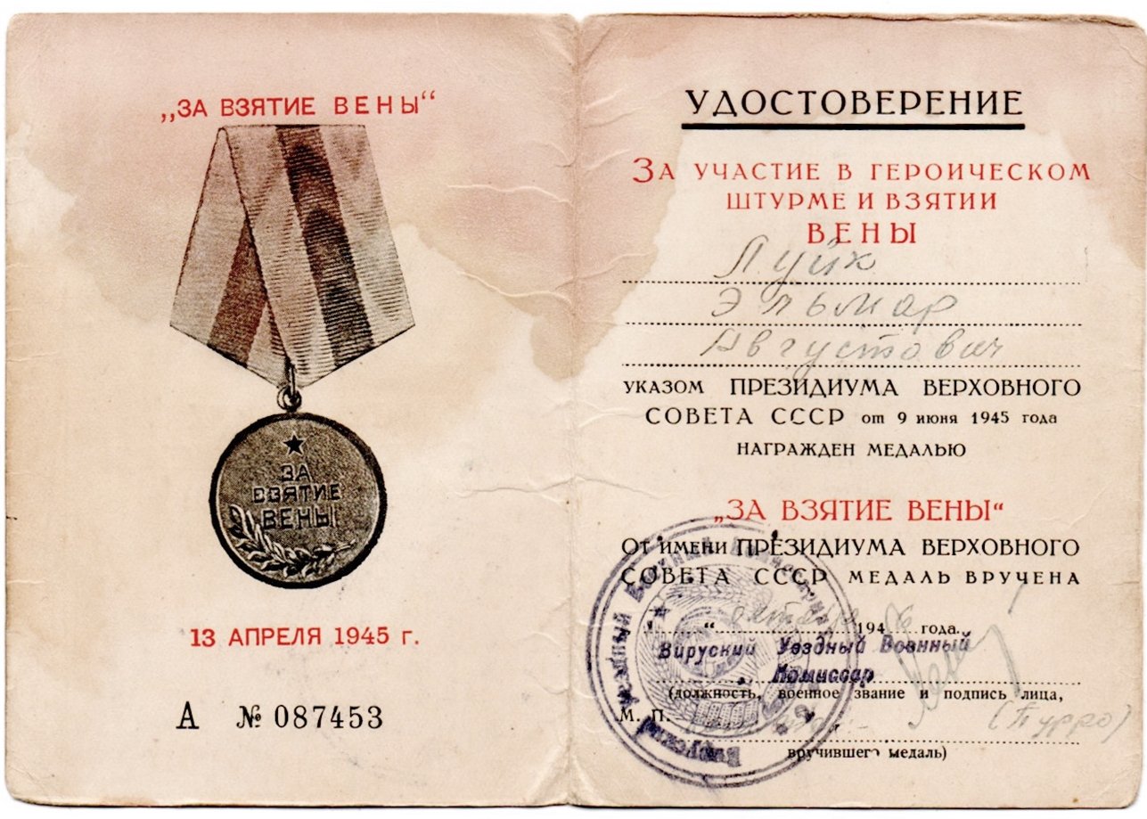 Viini vallutamise medaliga on autasustatud 106. Kaardiväe Kutuzovi ordeniga haubitsate polgu 3. patarei autojuht Elmar Luik. Pärit Narvast.