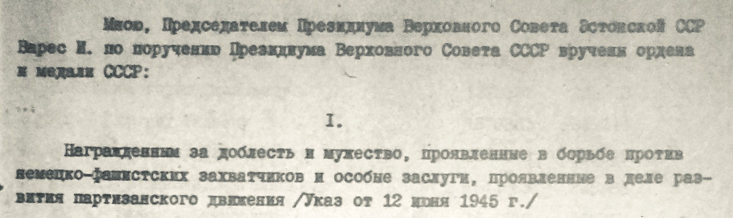 Varasem, 1944. aastast pärit NSVL Ülemnõukogu korraldus ENSV partisanide autasustamise kohta.