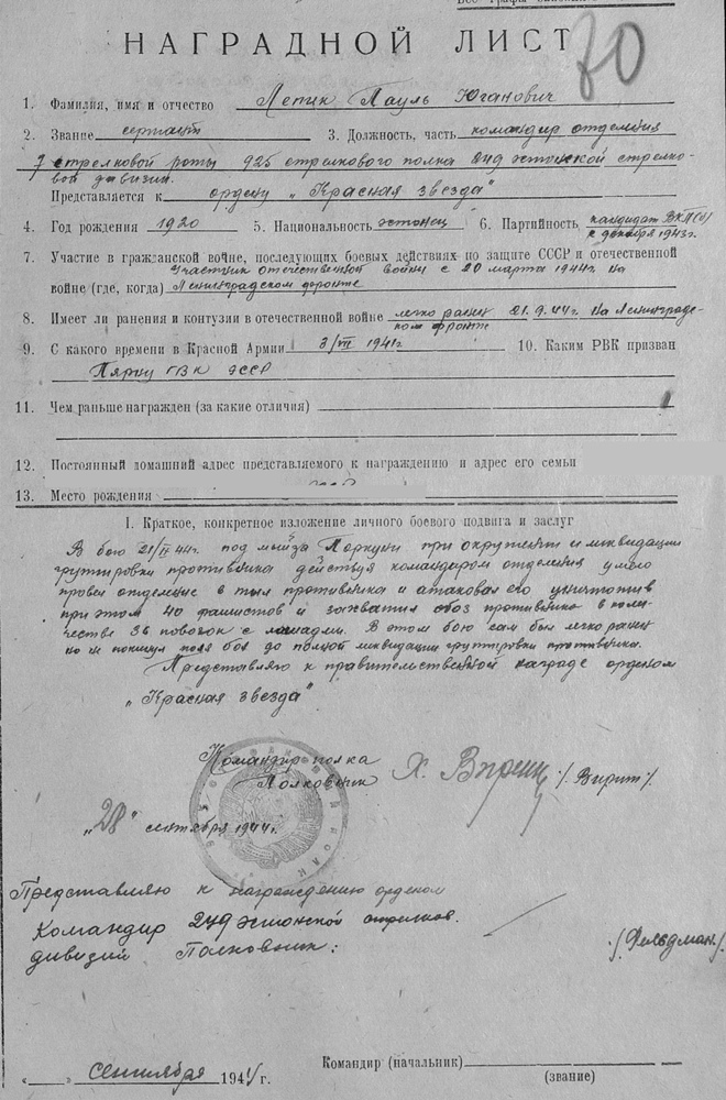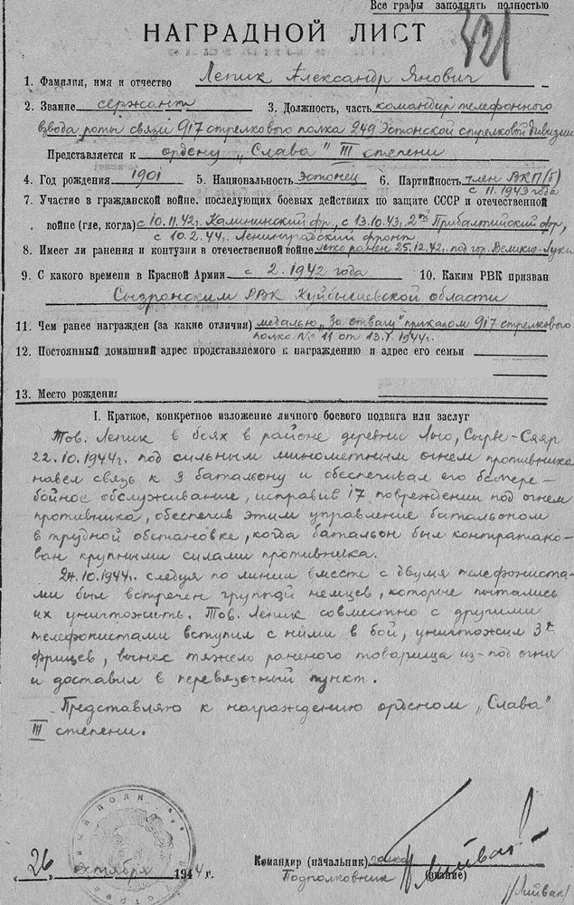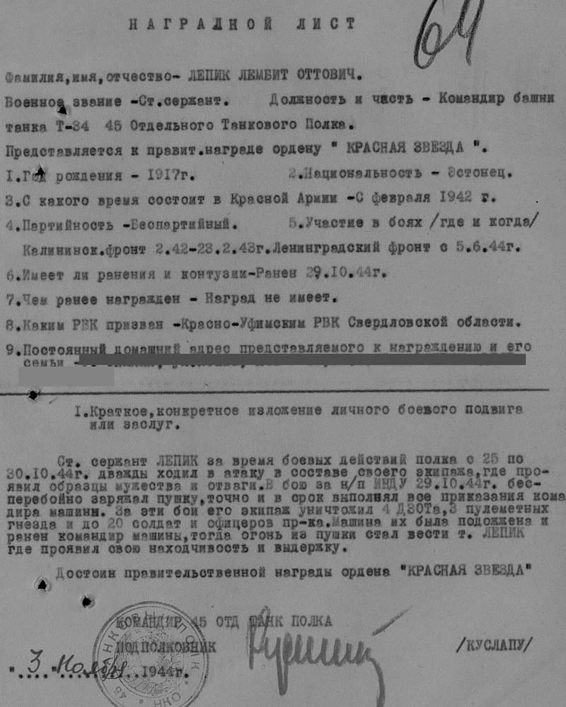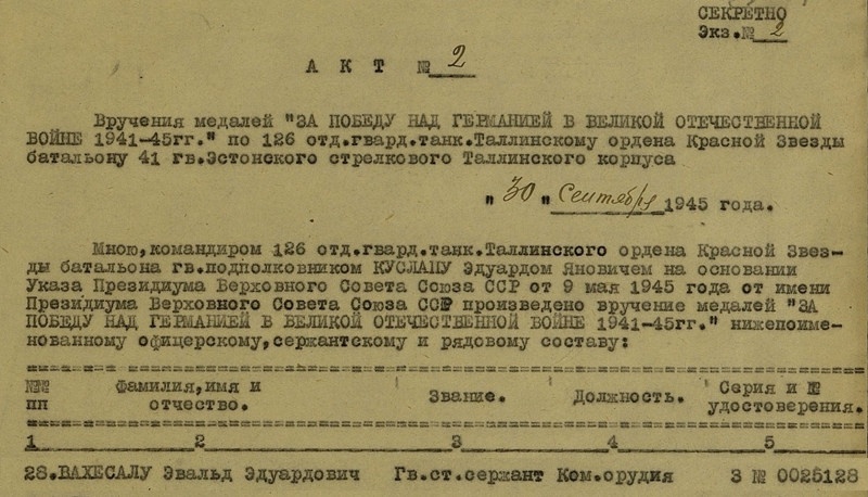 No a mis autasud snaiper Aru, siis reaalselt sai? Tegelikult võis olla nii, et selle Tallinna tembu eest esitati Punatähele, aga tegelikult sai Lahinguteenete medali. Kui autasulehte lõpuni vaadata ( kuni järgmise isiku autasustamiseni ) siis peaks olema näha, kas Punatäht tõmmati maha ja mis see lõplik tõde on... kui Sul muidugi ei ole kirjutuslaual kindlasti tema Punatähe ja Kuulsuse ordenid.