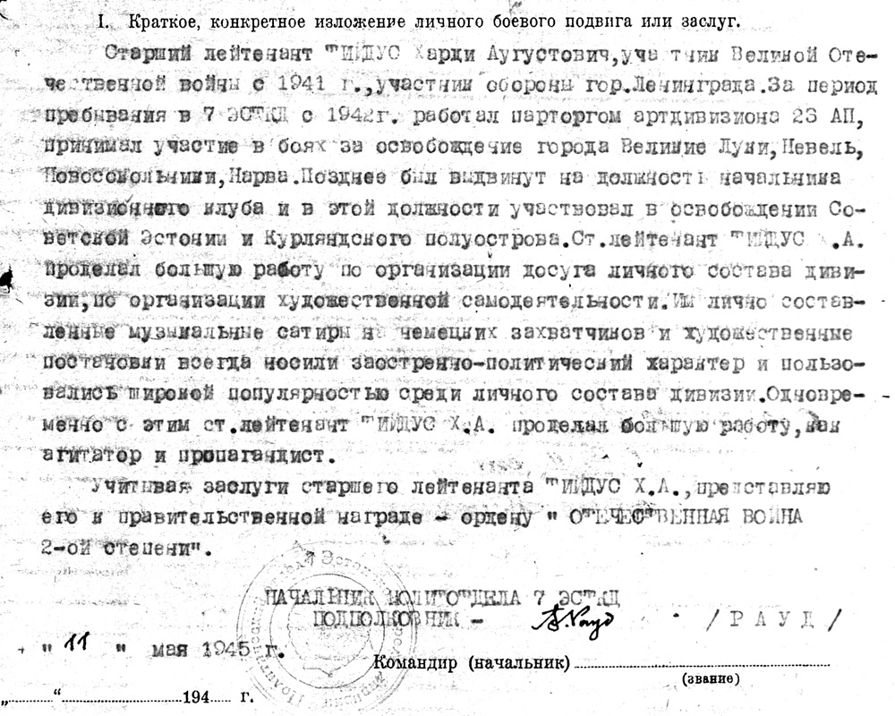 Hiljuti sai loetud sellist raamatut nagu '' Vana Hõbe. Hardi Tiidus ja inimesed tema ümber''. Mulle meeldis. Vähem on aga räägitud sellest, et 7. Laskurdiviisi klubi ja raamatukogu ülem, vanemleitnant H. Tiidus oli ka Isamaasõja II klassi ordeni kavaler, mille sai 1945. aastal. Kahjuks ei tea ma ordeni numbrit, kuid autasulehe leidsin üles.