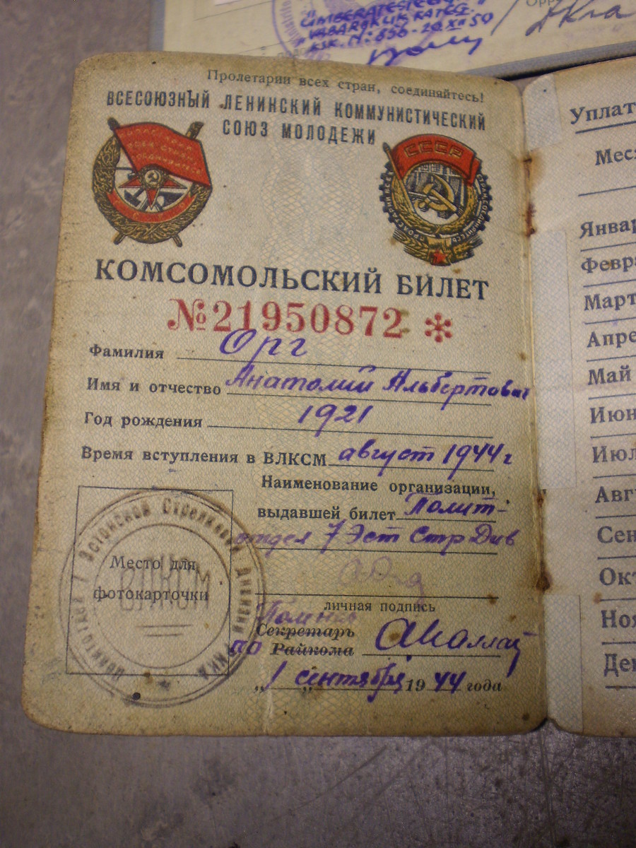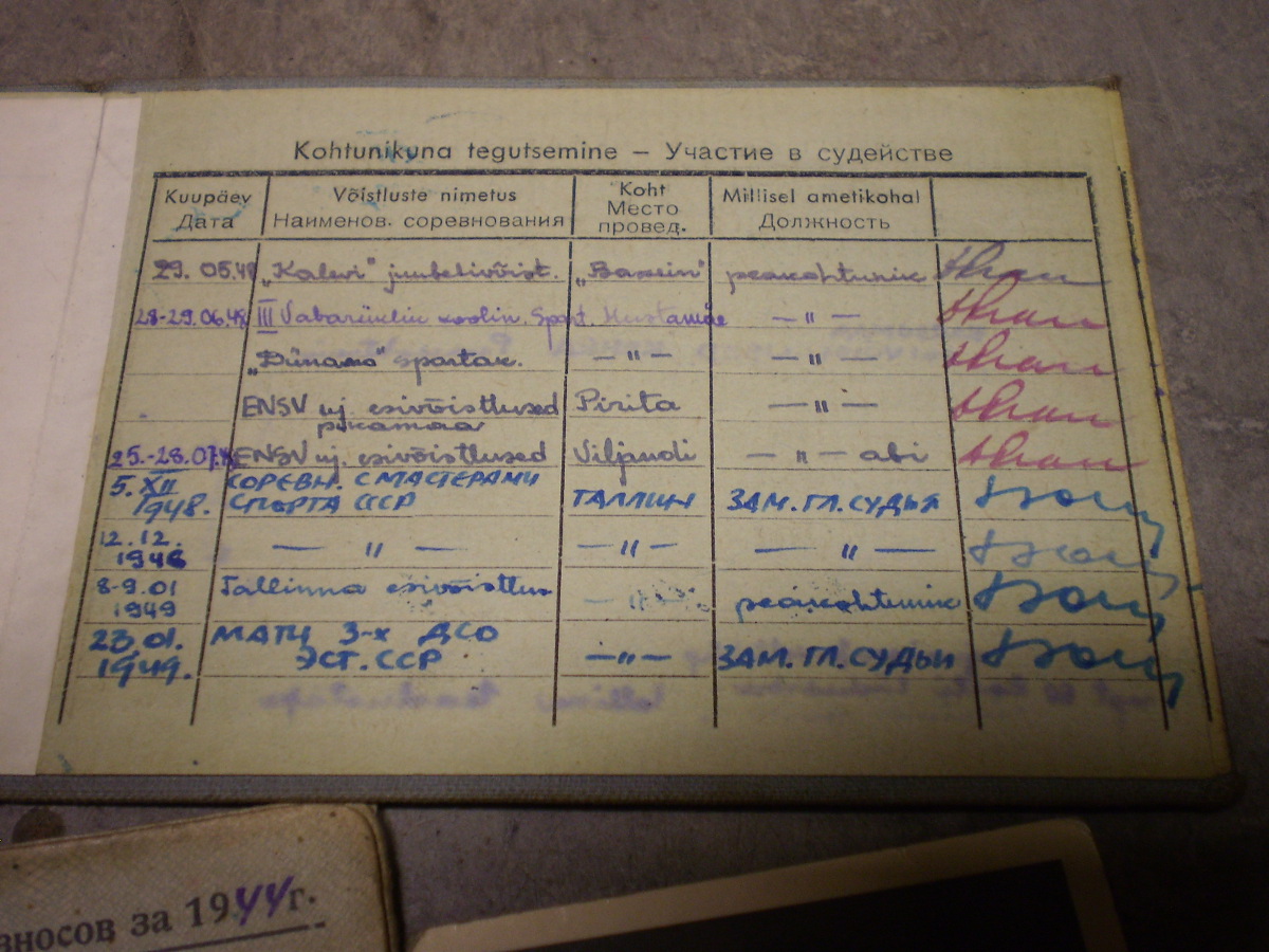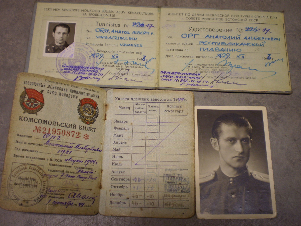 Kunagise ujumisässa Anatol Org-ile kuulunud piletid. Komsomoli pilet on sõjaaegne aga kas ka spordikohtuniku oma? Sees on küll kirjas, et kohtunikuks sai 1943 aastal.