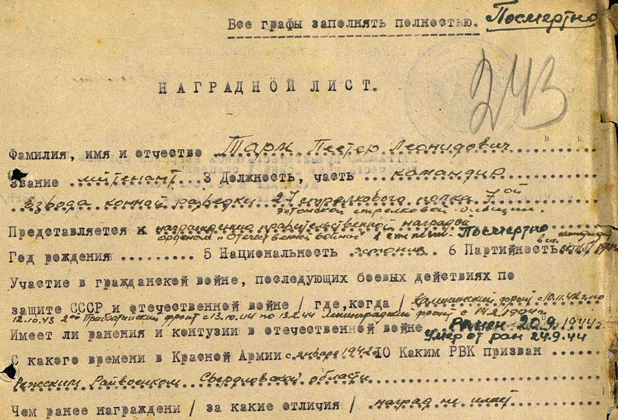 Leitnant Peeter Tarm. ELK 7. Laskurdiviisi, 27. Laskurpolgu ratsaluure rühmakomandor. Postuumselt autasustatud Isamaasõja I klassi ordeniga nr. 67265