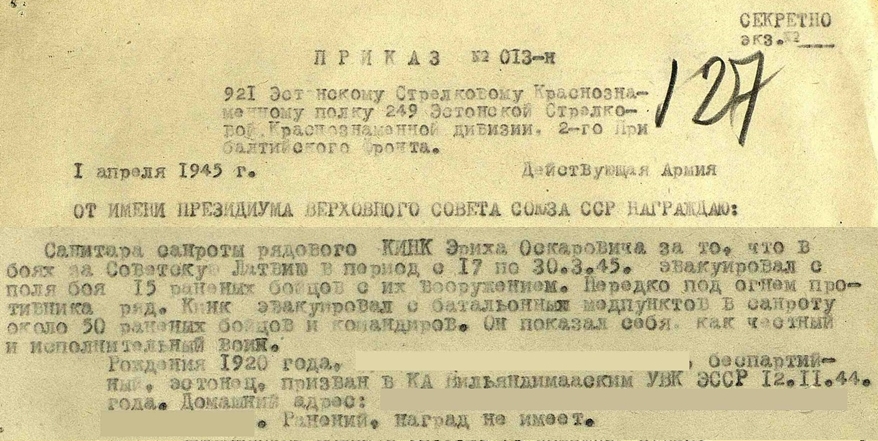 921. Laskurpolk 249. Laskurdiviis. Sanroodu sanitar, reamees Kink, Lahinguteenete medali 2892920 kavaler. Sai medali Kuramaa lahingute ajal, kus tõi märtsis 1945 lahinguväljalt ära suure hulga haavatud võitlejaid.