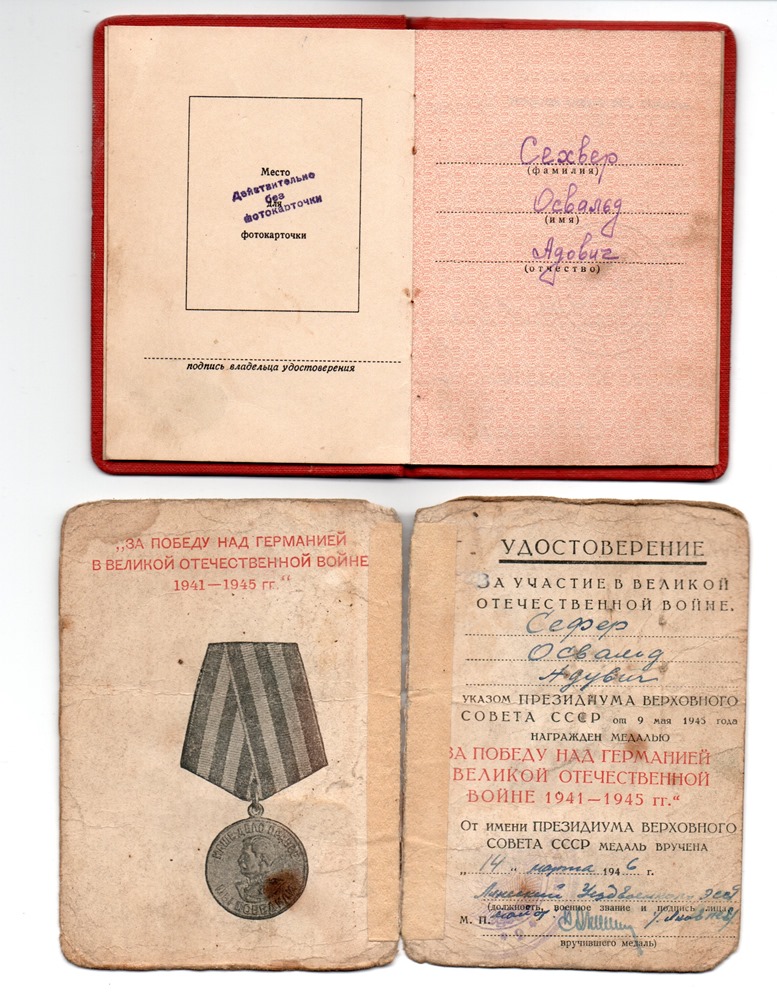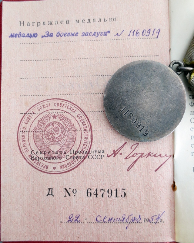 Lahinguteenete medali ajutise tunnistuse vahetas ta punakaanelise dokumendi vastu mingil põhjusel välja alles 1954. aastal. Medal ‘’Võit Saksamaa üle’’ on antud välja NKVD Balti mereväeehituse ehituspataljonide valitsuse poolt.