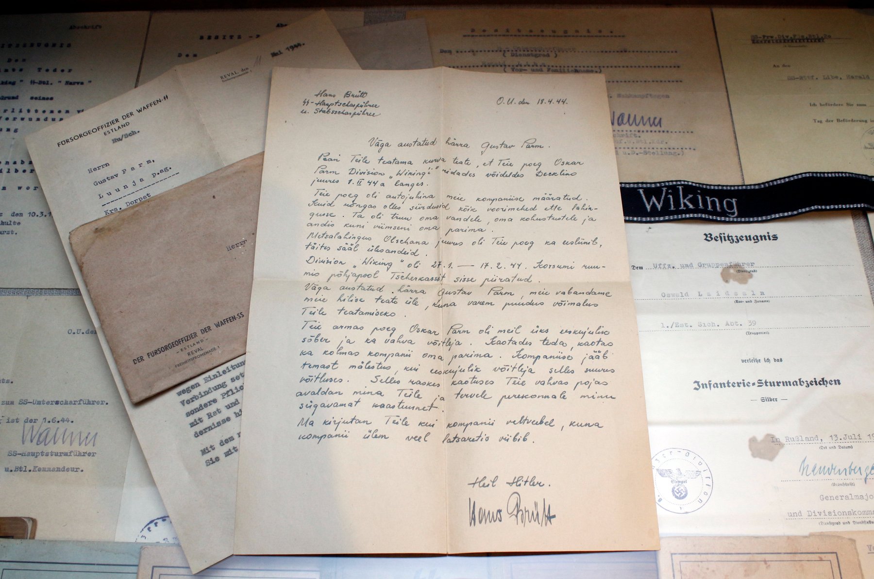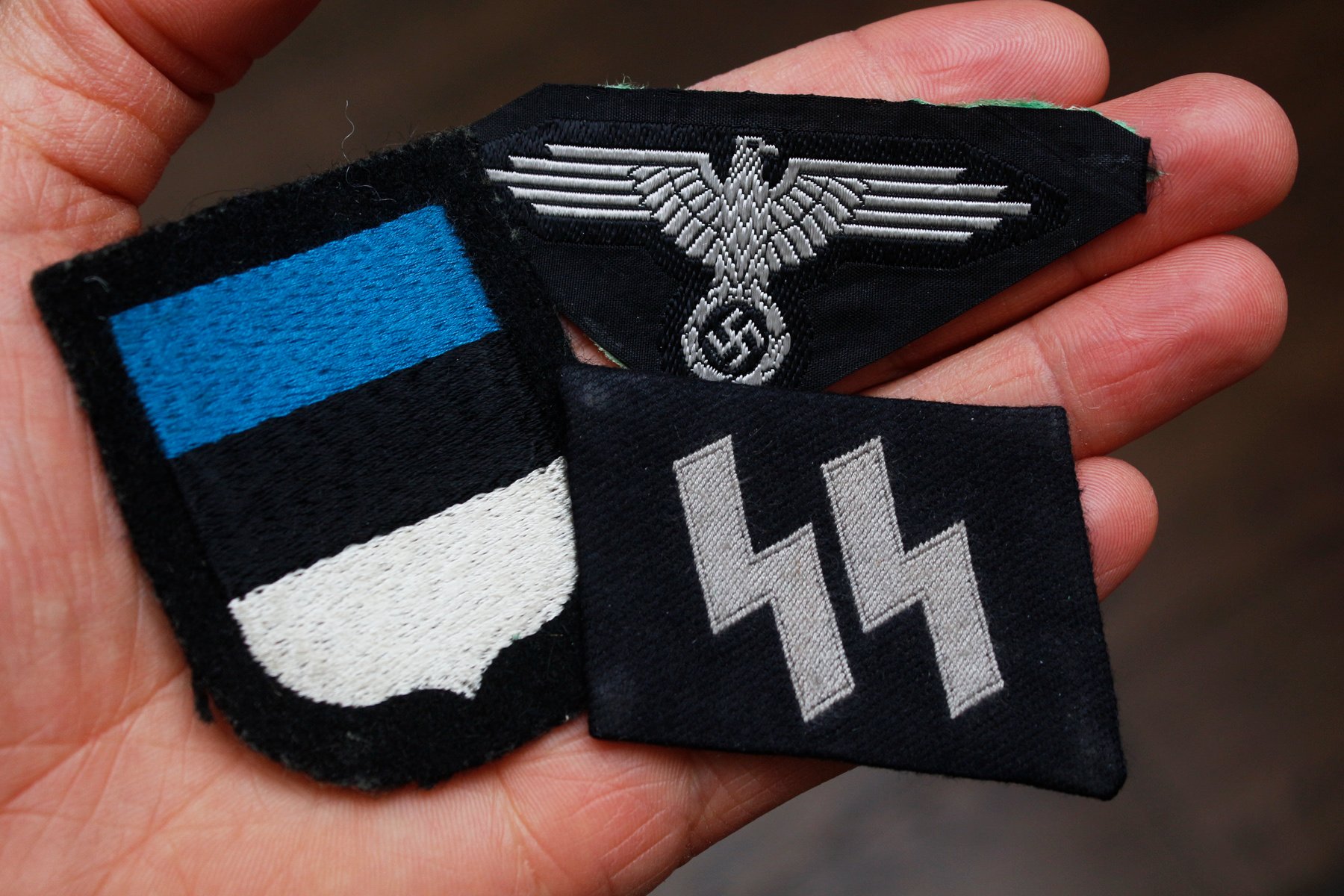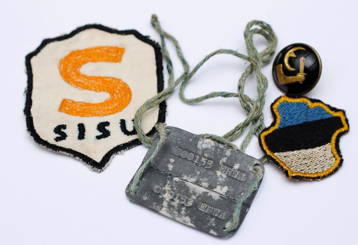 20. Eesti diviisi võitleja Ü.Käbin jättis endale sõjaajast mälestuseks oma vormikuuelt maha harutatud embleemid. Kogu Nõukogude okupatsiooniaja hoidis neid peidus ja võttis välja alles 1990-ndatel aastatel.