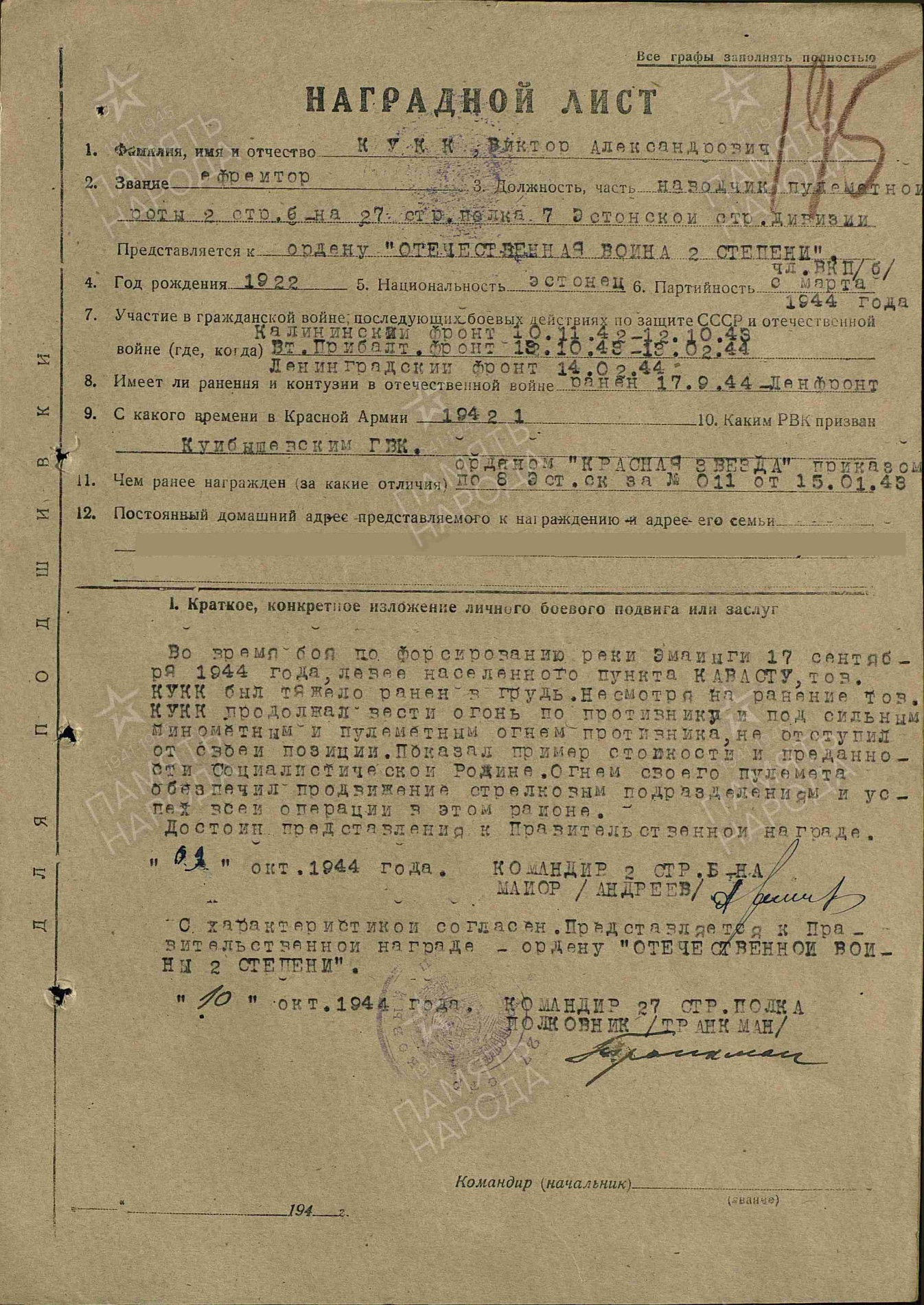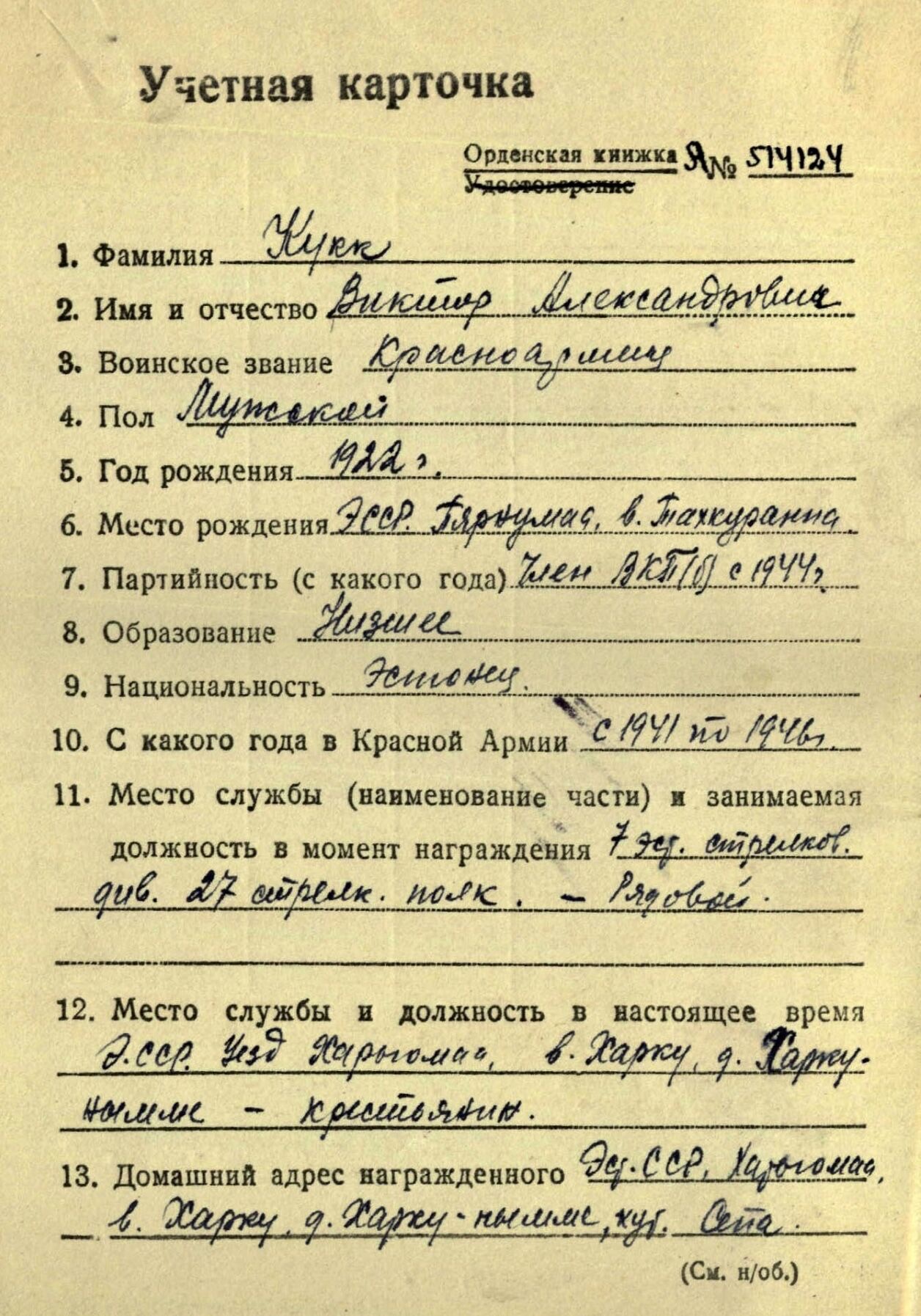 Korpusepoiss Viktor Kukk, 7. Eesti Laskurdiviis, 27. Laskurpolk. Punaarmees alates 1942. Punatähe ja Kuulsuse III järgu ordeni kavaler. Haavata saanud kaks korda.