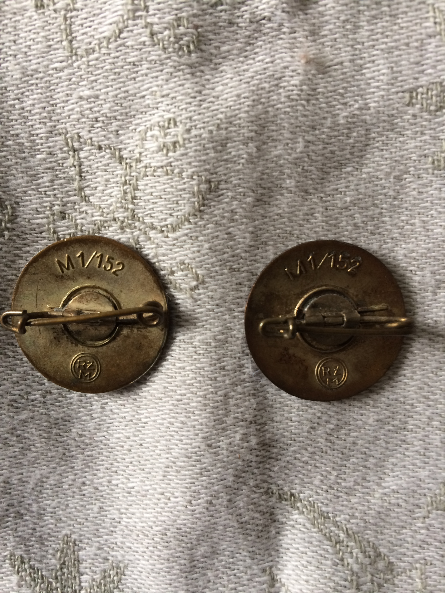 Mõnikord võib rõõmsalt üllatuda ka ilma ühtegi uut märki ostmata ja lihtsalt oma kogu korrastades. M1/34 RZM (Karl Wurster, Markneukirchen) on üks tavalisemaid parteimärkide tootjaid ja seega ei midagi erilist. Minu kogus oli see aga üks esimestest märkidest ja kui sain teise sama tootja märgi, siis mõtlesin kunagi selle kas ära vahetada või müüa. Nüüd kogu korrastades aga selgus, et mul on siiski kaks täiesti erinevat M1/34 märki ja seega pole siin vahetada midagi - märgi tagumised küljed on täiesti erinevad: