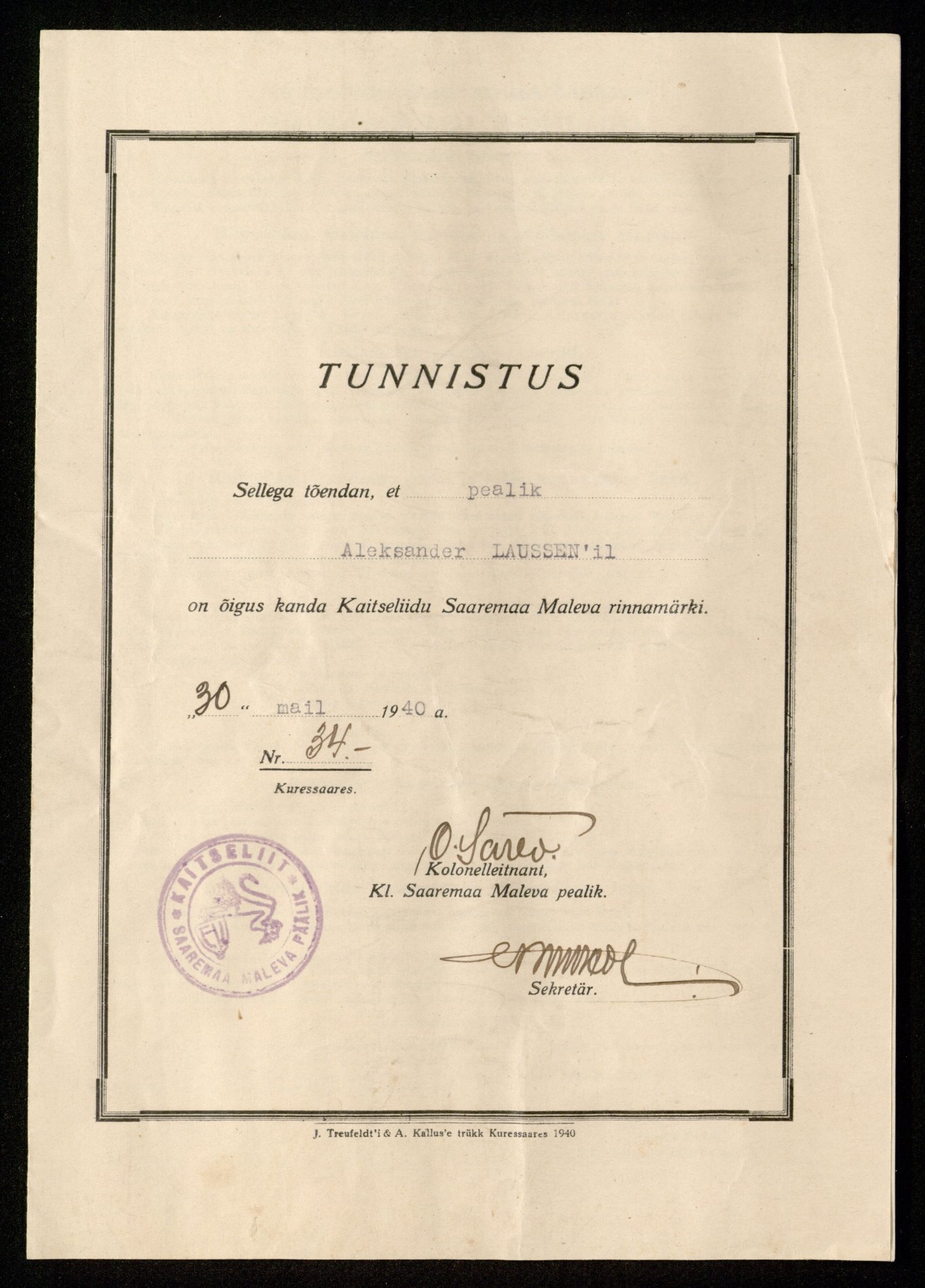 Eesti kaitseliidu Saaremaa maleva rinnamärgi tunnistus: Aleksander Laussen, KLM ET 1530:4 F.14, Eesti Sõjamuuseum - Kindral Laidoneri Muuseum, http://www.muis.ee/museaalview/1564471