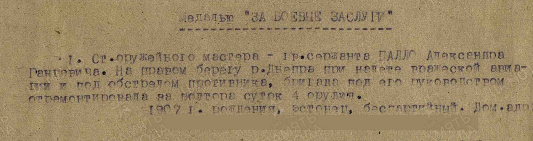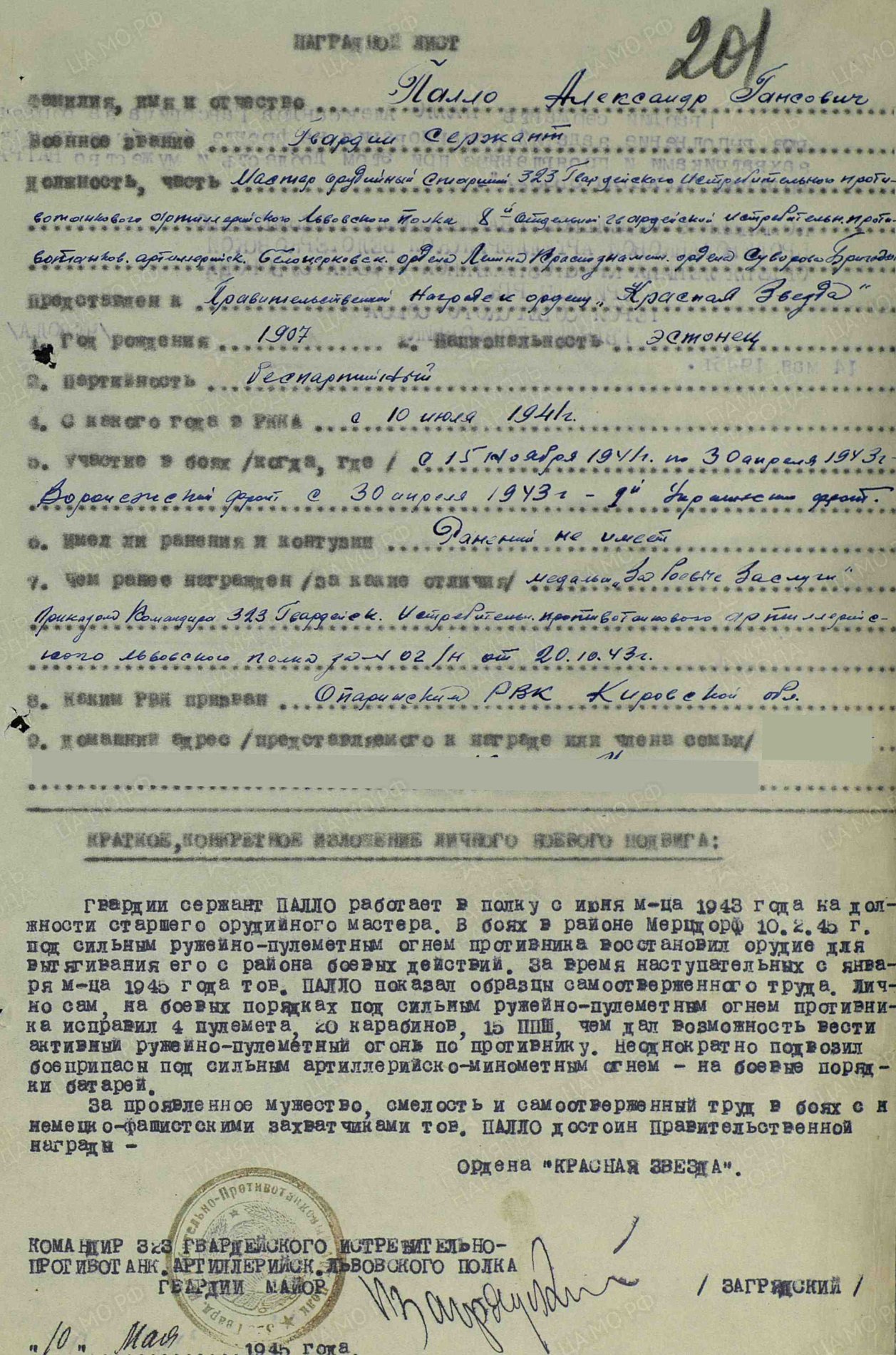 Kaardiväe seersant Aleksander Hansu p. Pallo teenis 8. kaardiväe tankitõrje suurtükiväebrigaadis ja teda autasustati Punatähe ordeniga (1808921) ja Lahinguliste teenete eest medaliga (560660).