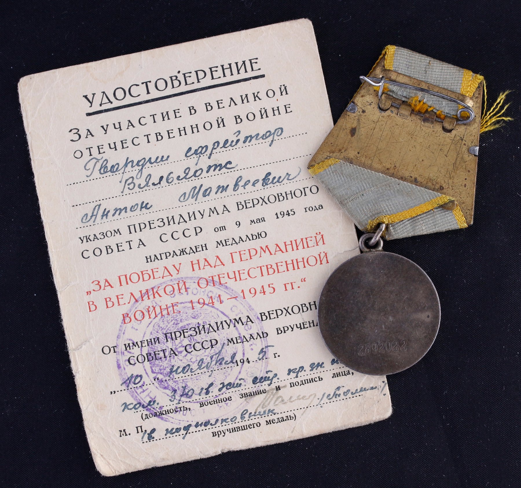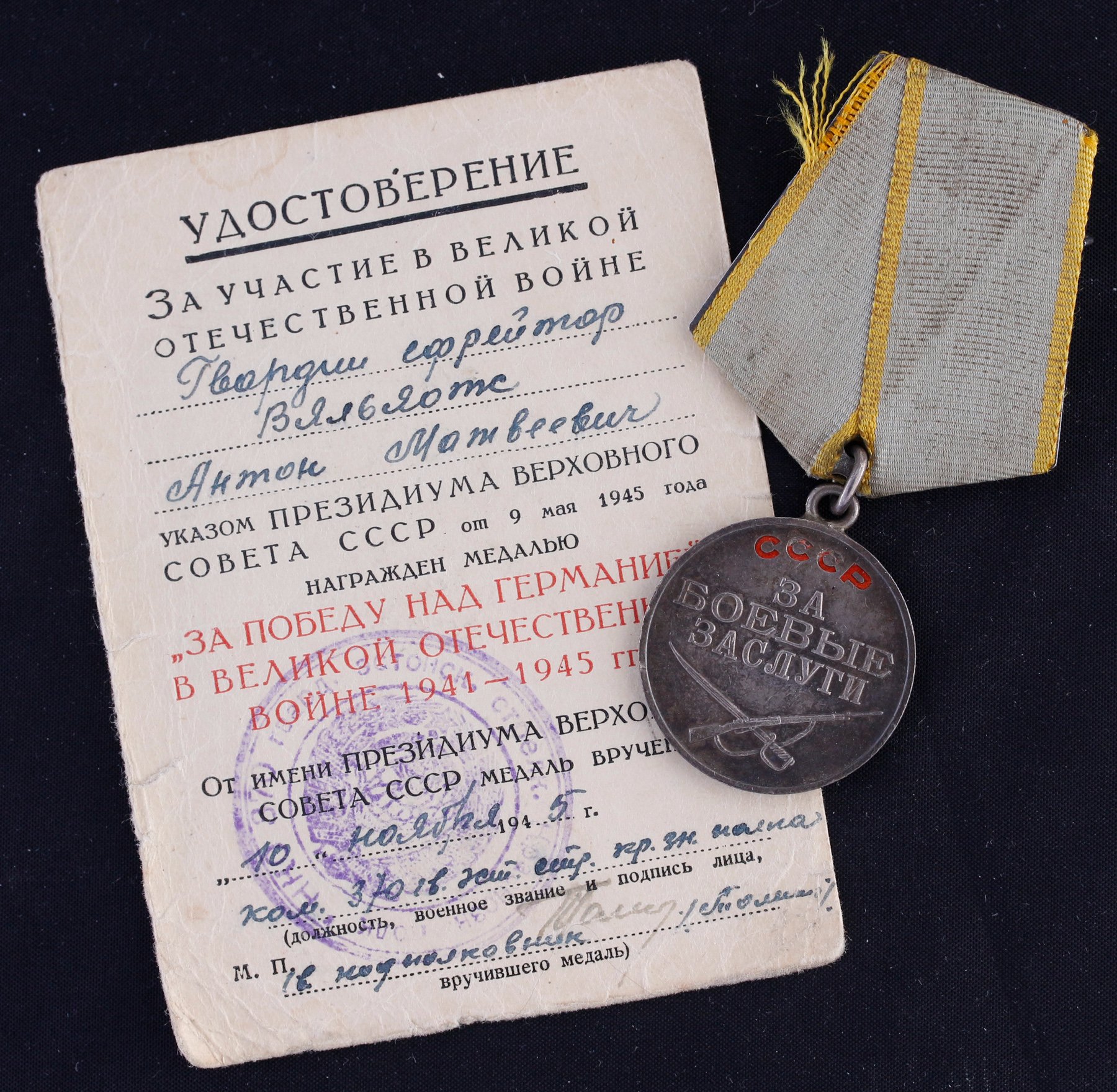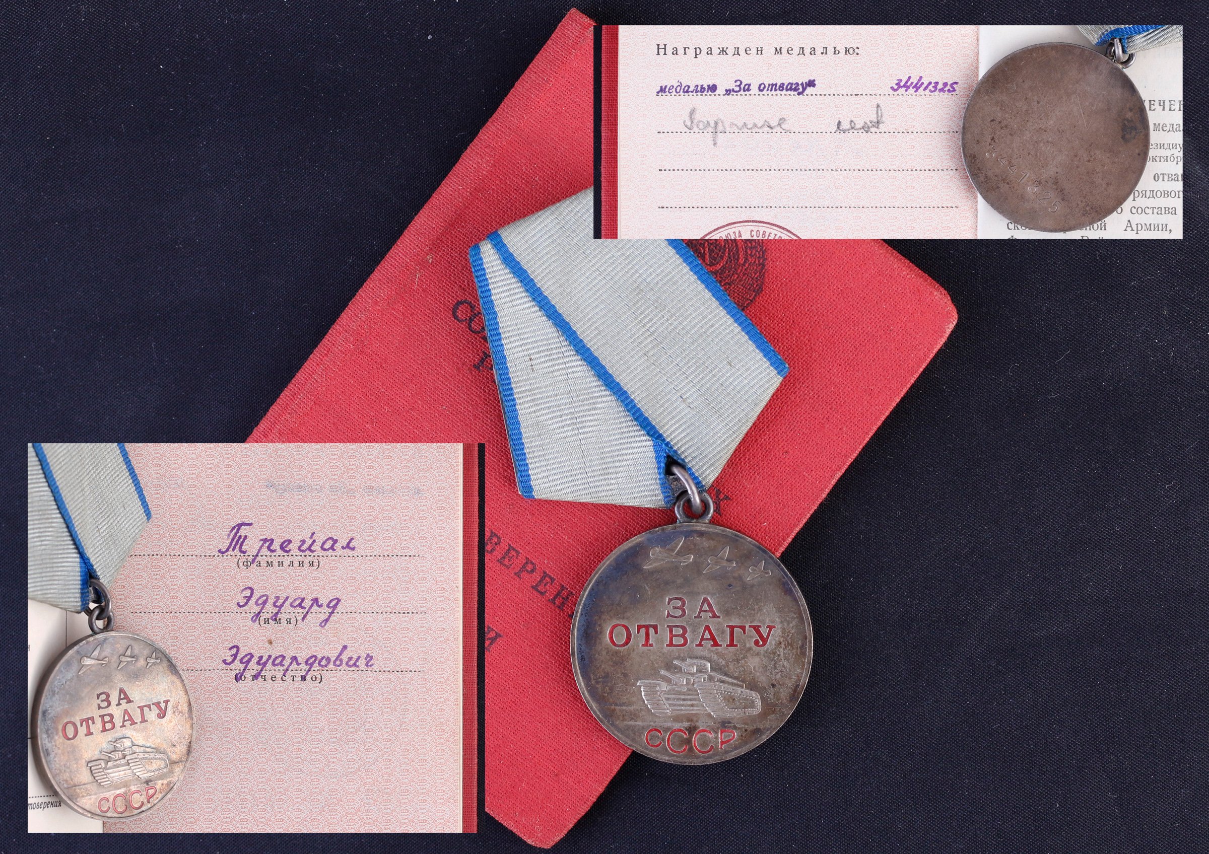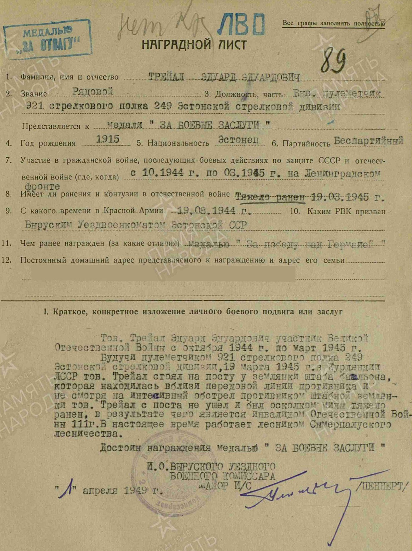249. laskurdiviisi 921. laskurpolgu reamees Eduard Treial'i Vapruse medal (3441325) - sai 19.03.1945 Kuramaal raskelt haavata ja selle eest hiljem medali saanud.