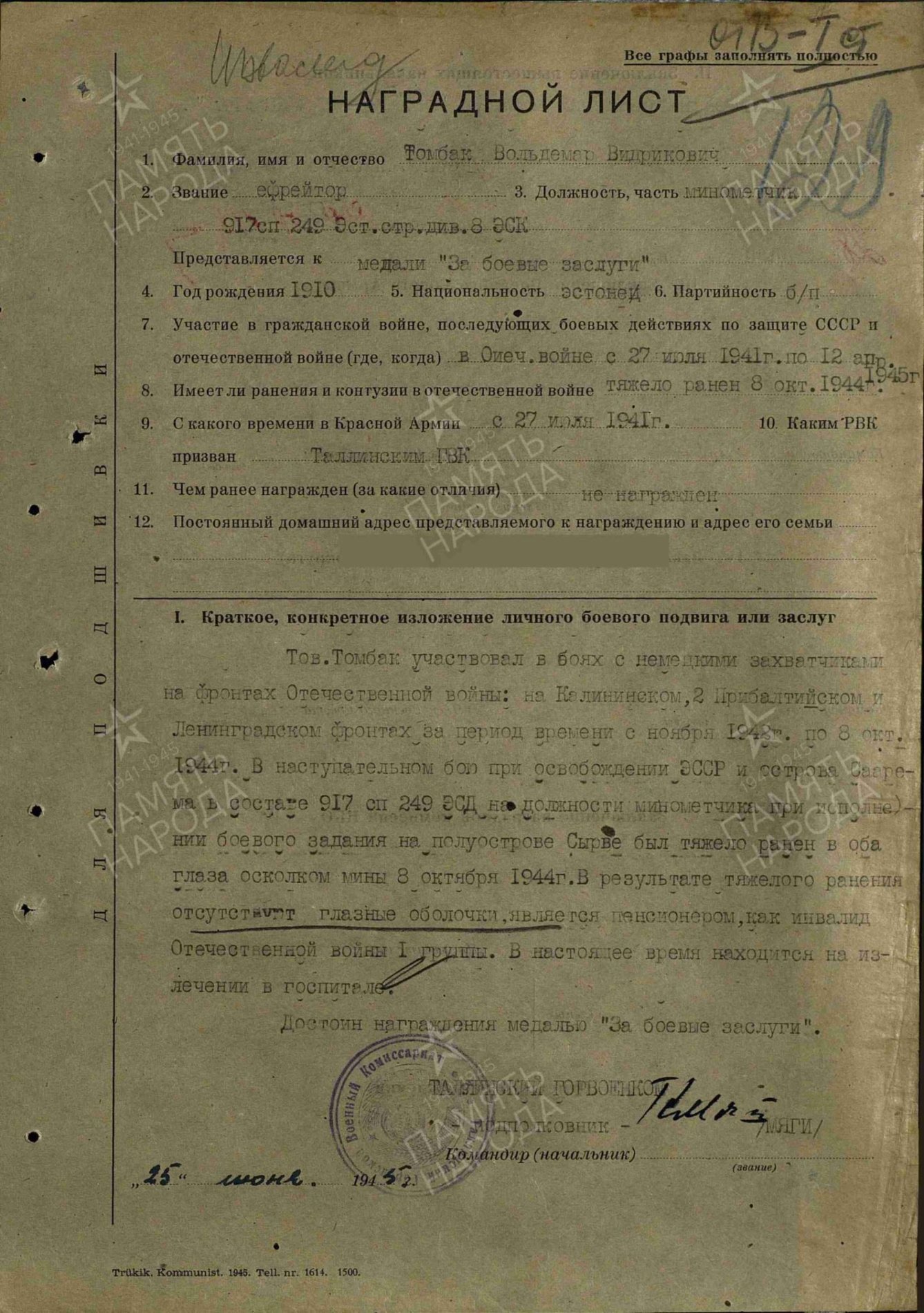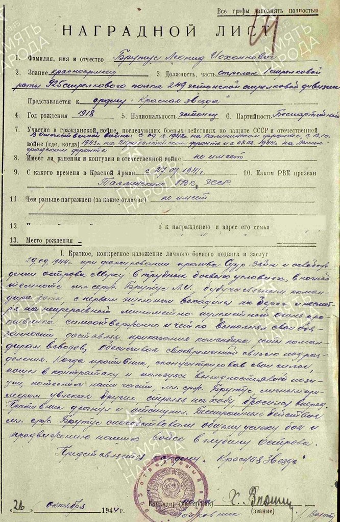 249. Eesti laskurdiviisi 925. laskurpolgu 1. laskurroodu laskur, nooremseersant Leonid Brutus. Punatähe ordeni nr. 1146956 kavaler.