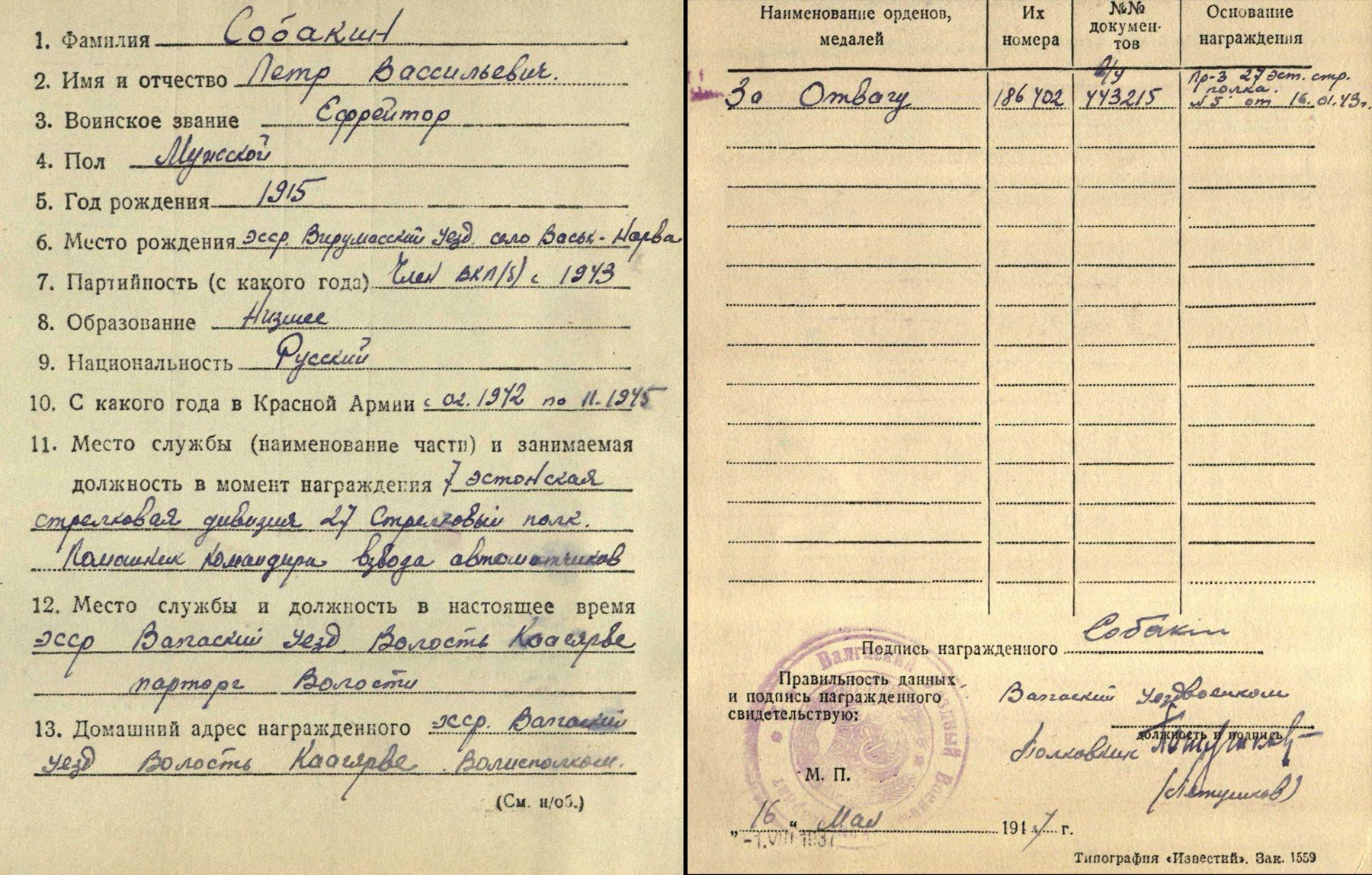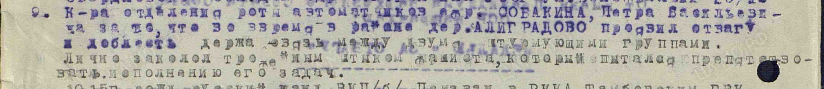 Ning veel üks Velikije Luki lahingute eest annetatud Vapruse medal (186402), mis mul on juba aastaid olnud aga nüüd sain arhiivist info ka juurde. Autasu on annetatud 1943. aasta 16. jaanuaril 8. ELK'i 7. laskurdiivisi 27. laskurpolgus teeninud Vasknarvast pärit venelasele, automaaturite rühma ülemale jefreitor Peeter Sobakin'ile. Medal annetati Luki linnast lõunasse jääva Aligradovo asula juures toimunud lahingu eest. Kes sellest kirjeldusest aru saab võiks siia ka eesti keelse tõlke lisada.