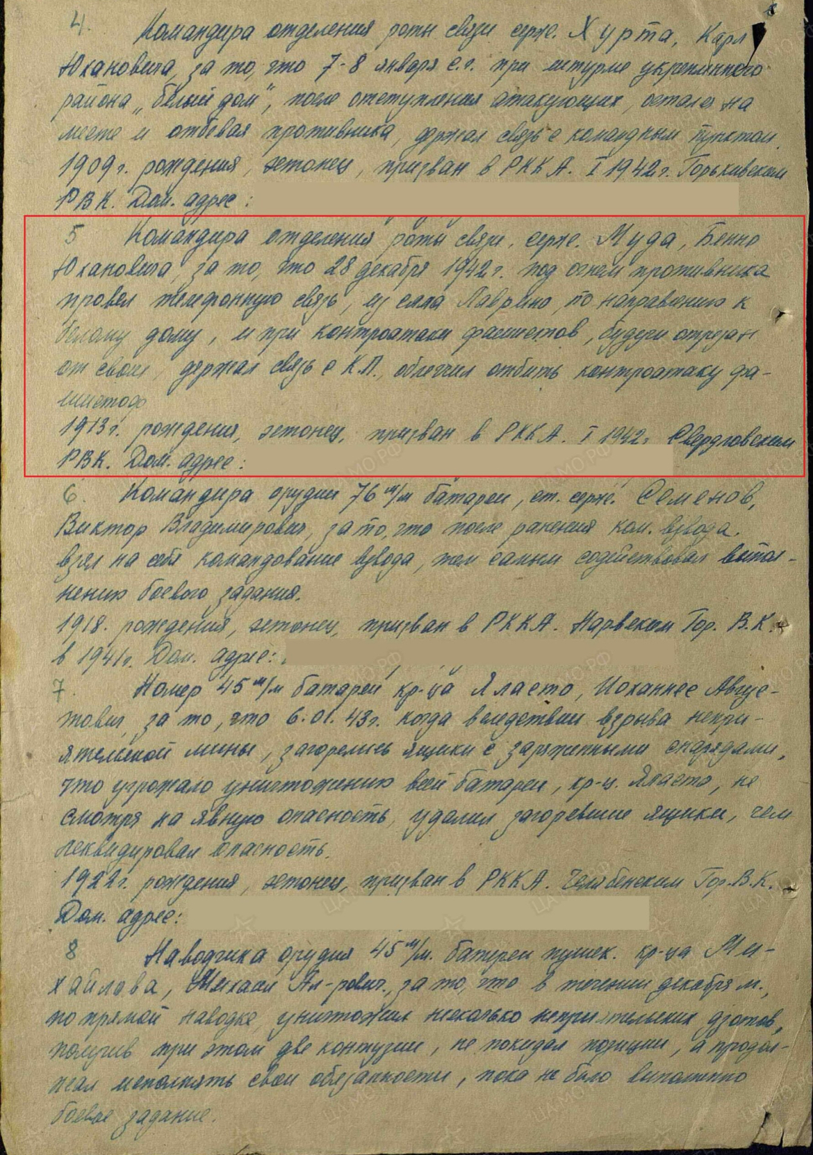 Korpusepoiss Benno Muda. 7. Eesti Laskurdiviis, 300. Laskurpolk. Punaarmees alates 1942. Vapruse medali 186377 kavaler.