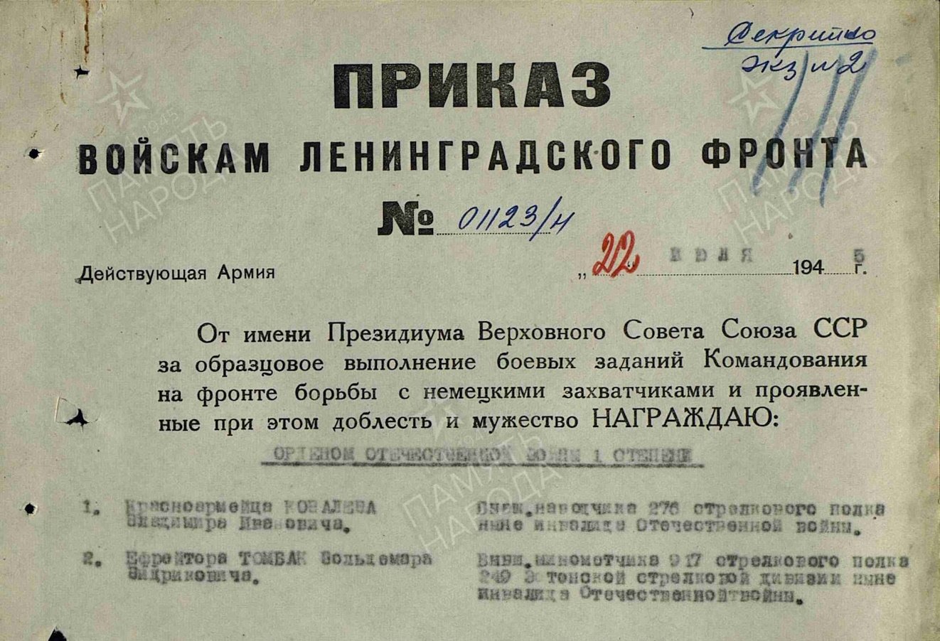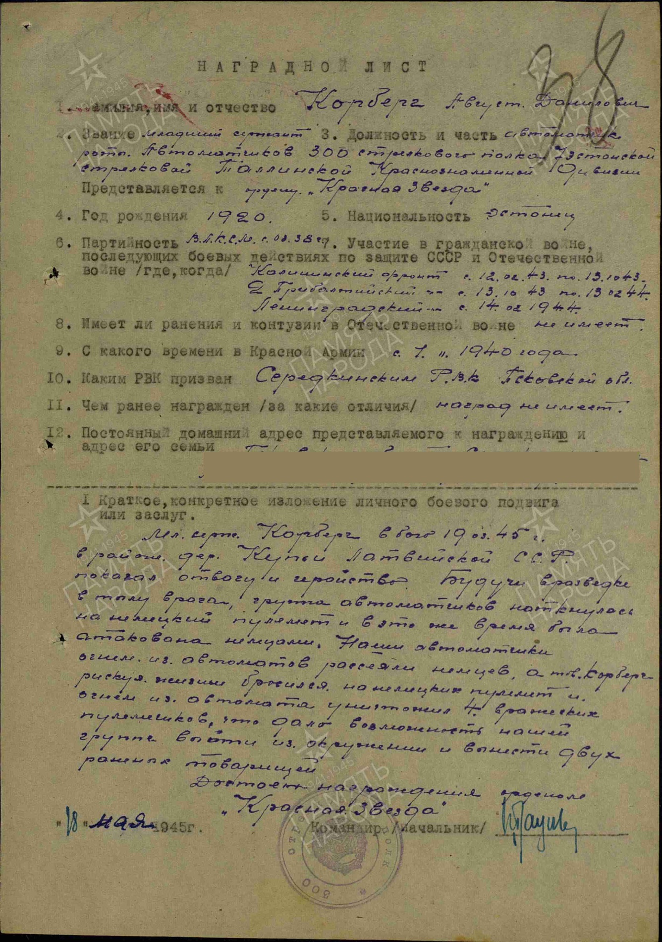 Korpusepoiss August Korberg, Venemaa eestlane kes on sündinud Pihkvas. 7. Eesti laskurdiviis, 300 laskurpolk. Punaarmees alates 1940. Vapruse medali 2764409 ja Kuulsuse ordeni III järk 303446 kavaler. Mõlemad autasud saadud Kuramaa lahingus. Vajan abi Vapruse medali autasulehega…