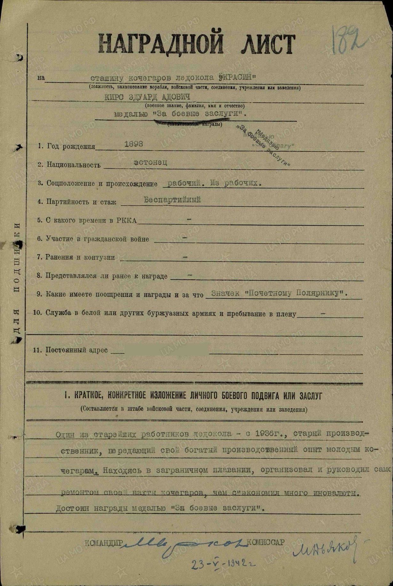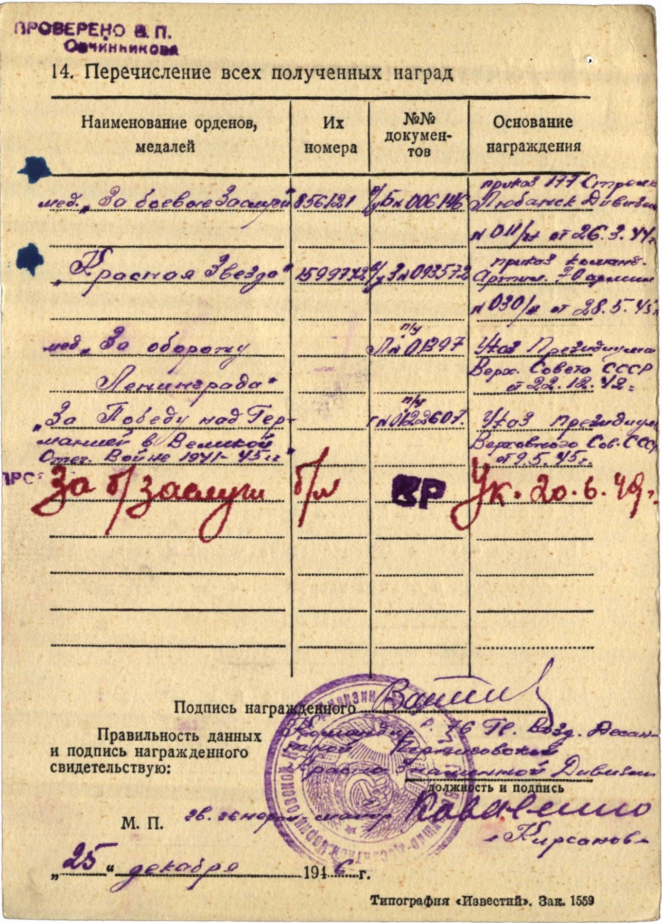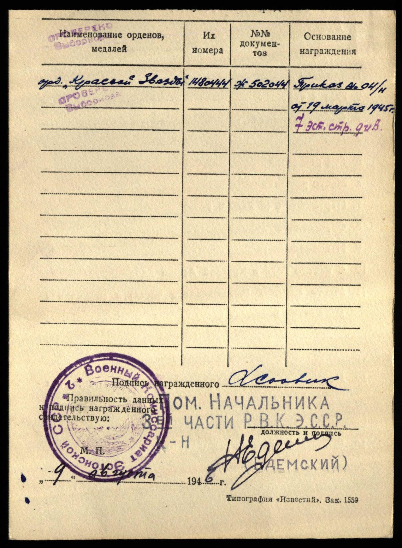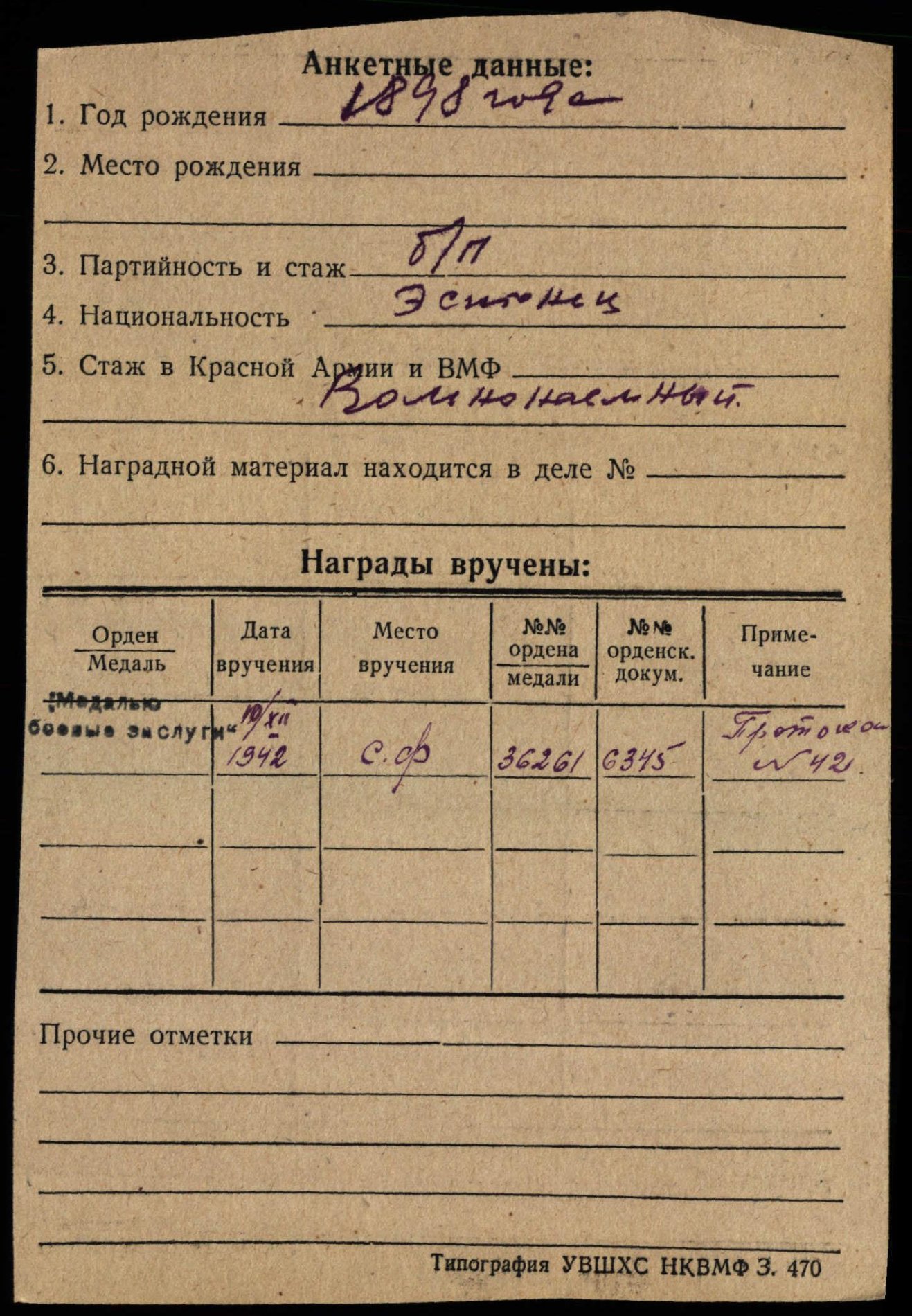 See lahinguteenete medal pole antud Korpusele või Eestlasele, kuid see on seotud 1944 Veebruaris toimunud lahingutega Narva rindel. Kavaler on saanud ka punatähe, ilmselt Kuramaa lahingute eest kuid ma ei leidnud autasulehte pamyatis kuna tema nimelisi on seal 500 lehekülge. Kui keegi loeb sünnikoha välja oleks abi…
