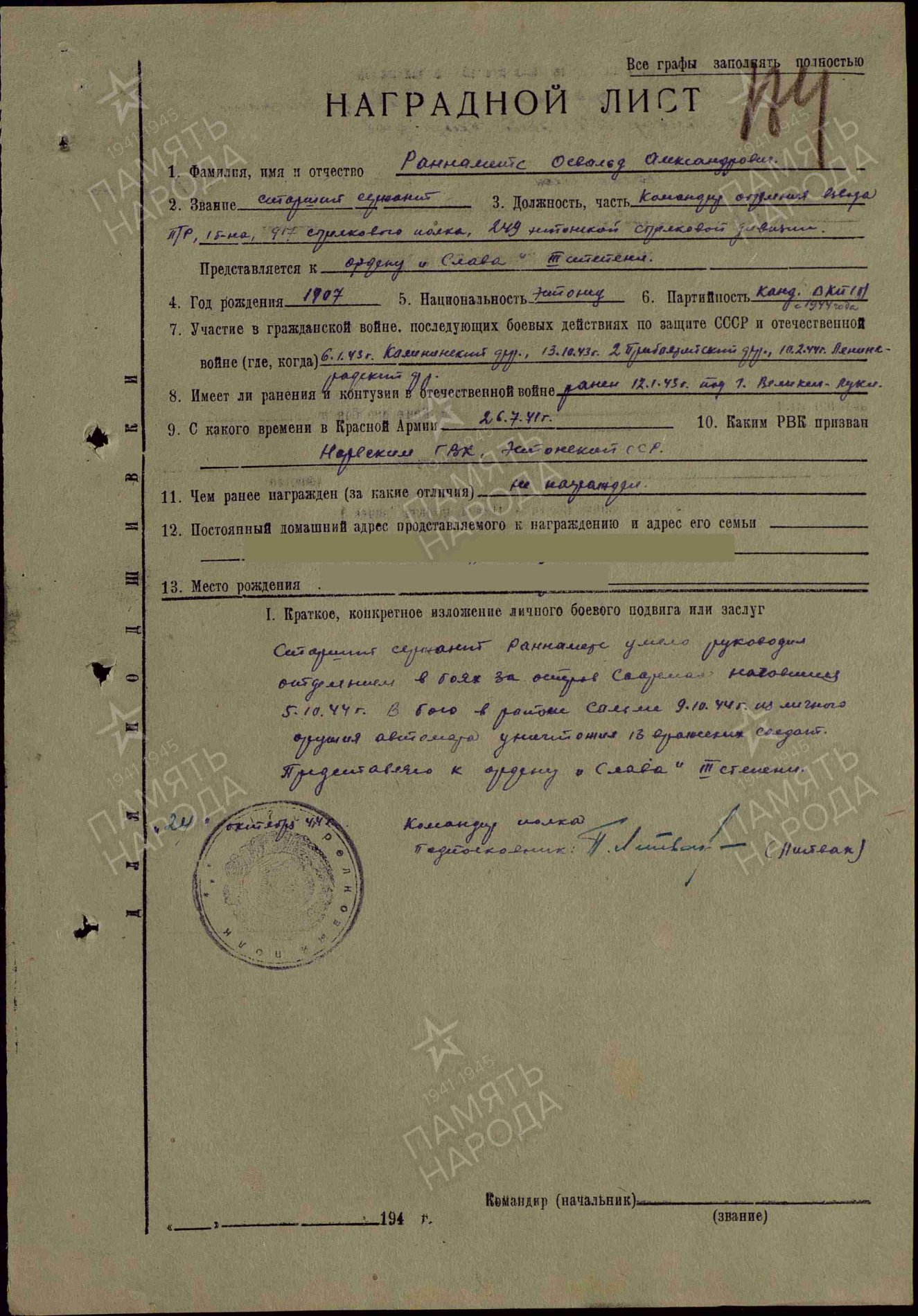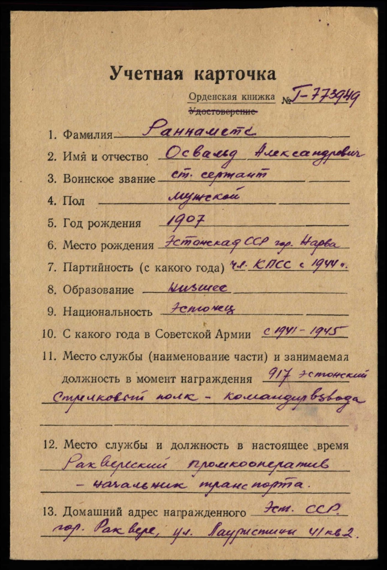 Tuleb välja, et hoopis Saaremaa lahingute eest. Vanemseersant Osvald Rannamets, tankitõrjerühma jaokomandör, 249. Laskurdiviis, 917. laskurpolk. Kuulsuse III klassi ordeni nr. 172517 kavaler.