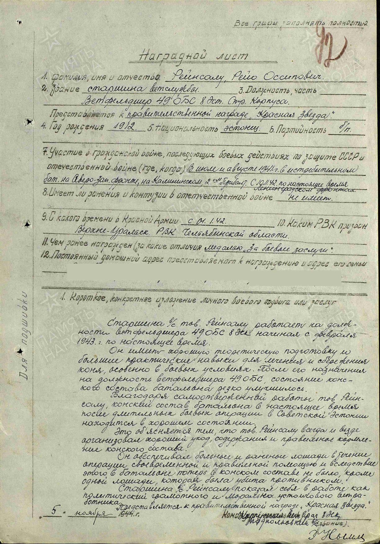 Punatähe orden 939403 on antud 8. Eesti laskurkorpuse 49. üksiku sidepataljoni veterinaarile, vanem Reio Reinsalu'le. Talusulase perre sündinud Reinsalu sai peale nõukogude võimu kehtestamist Viljandis miilitsavolinikuks, 1941. aastal astus Viljandi hävituspataljoni ja võttis osa ka lahingutest Tallinna pärast. Peale sõda oli Tori ja Vändra Täitevkomitee esimees.
