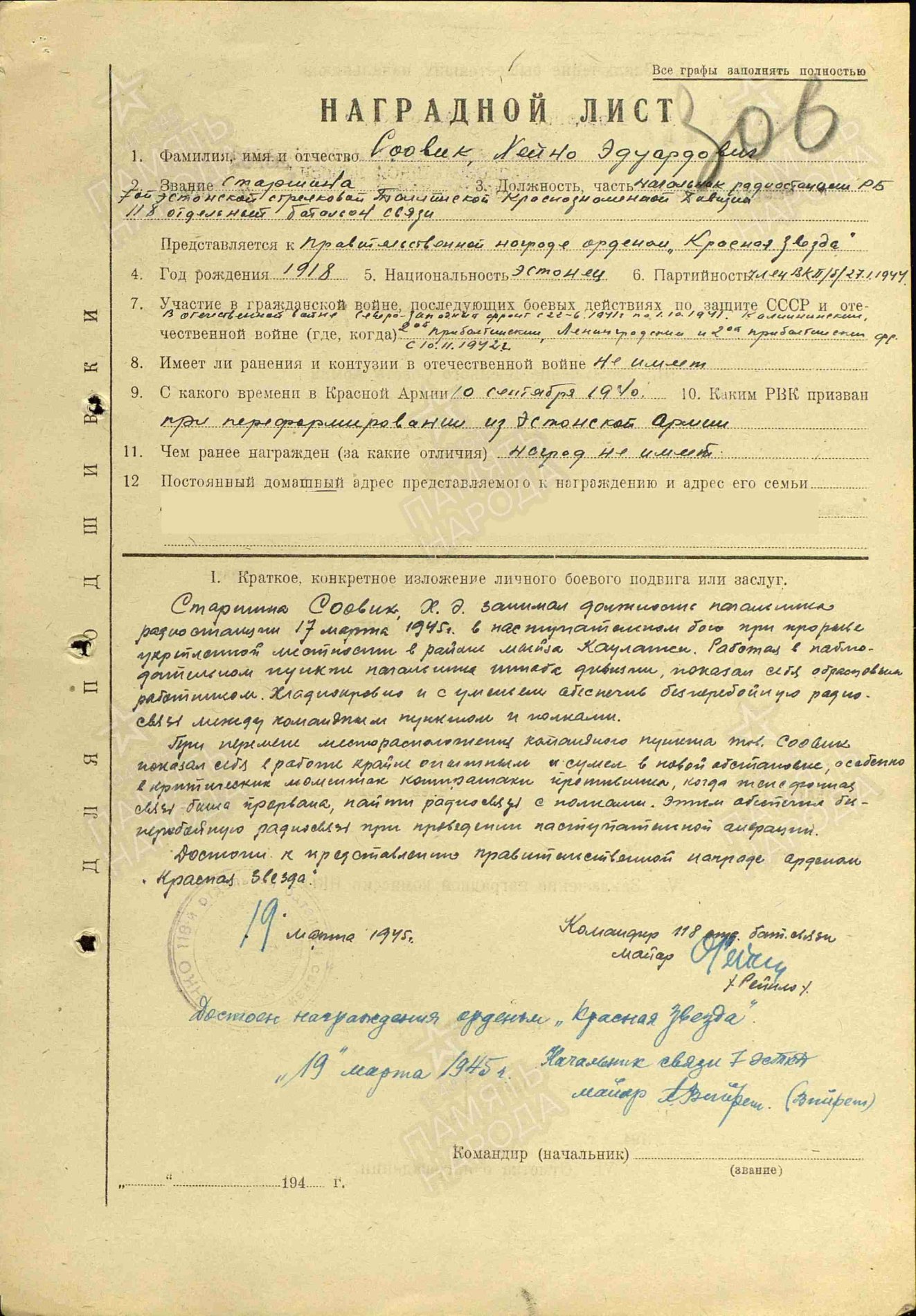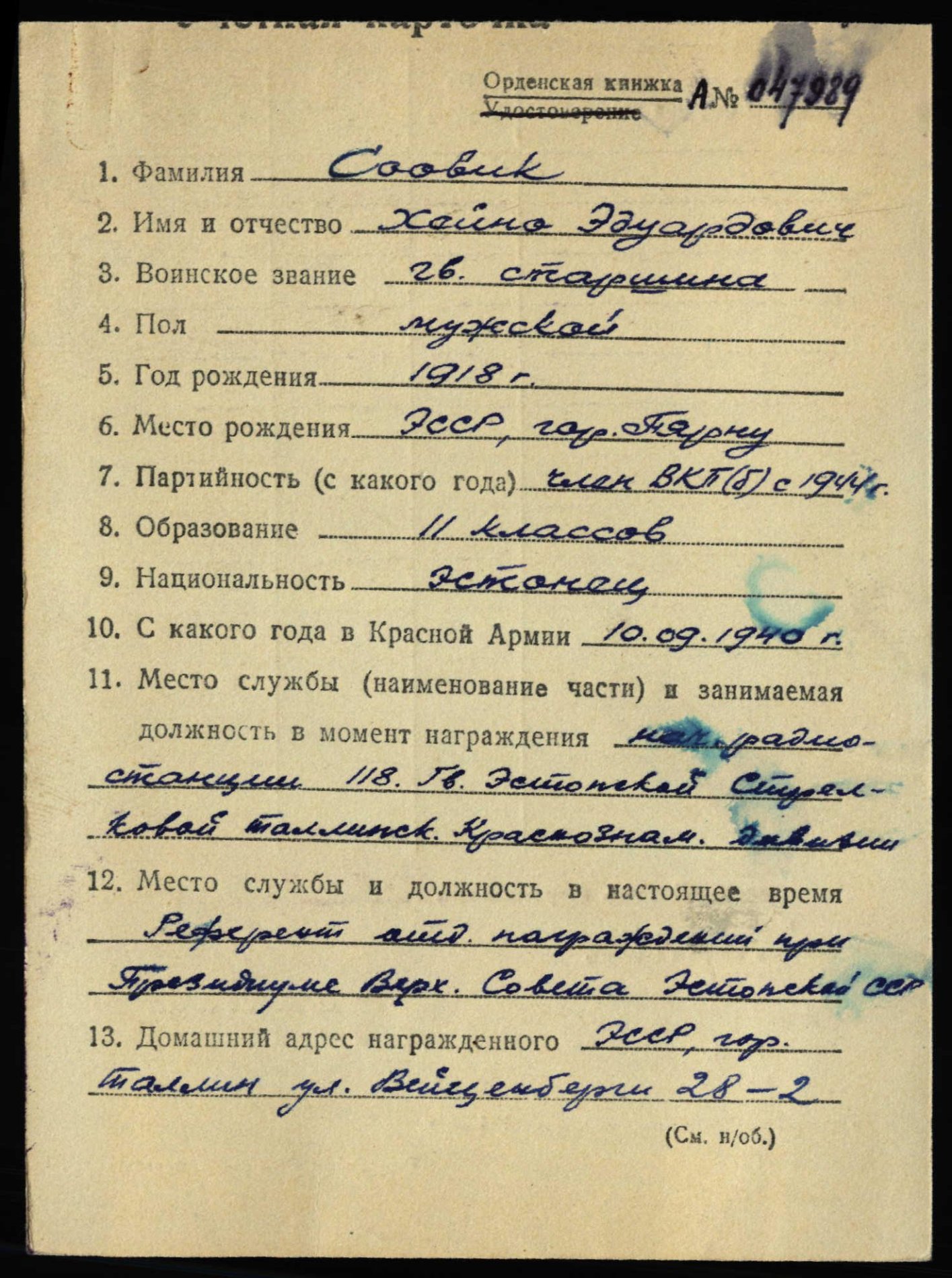 Vanem Heino Soovik, 7. Eesti laskurdiviisi 118. üksiku sidepataljoni raadiojaama ülem. Punatähe ordeni nr. 1480444 kavaler.