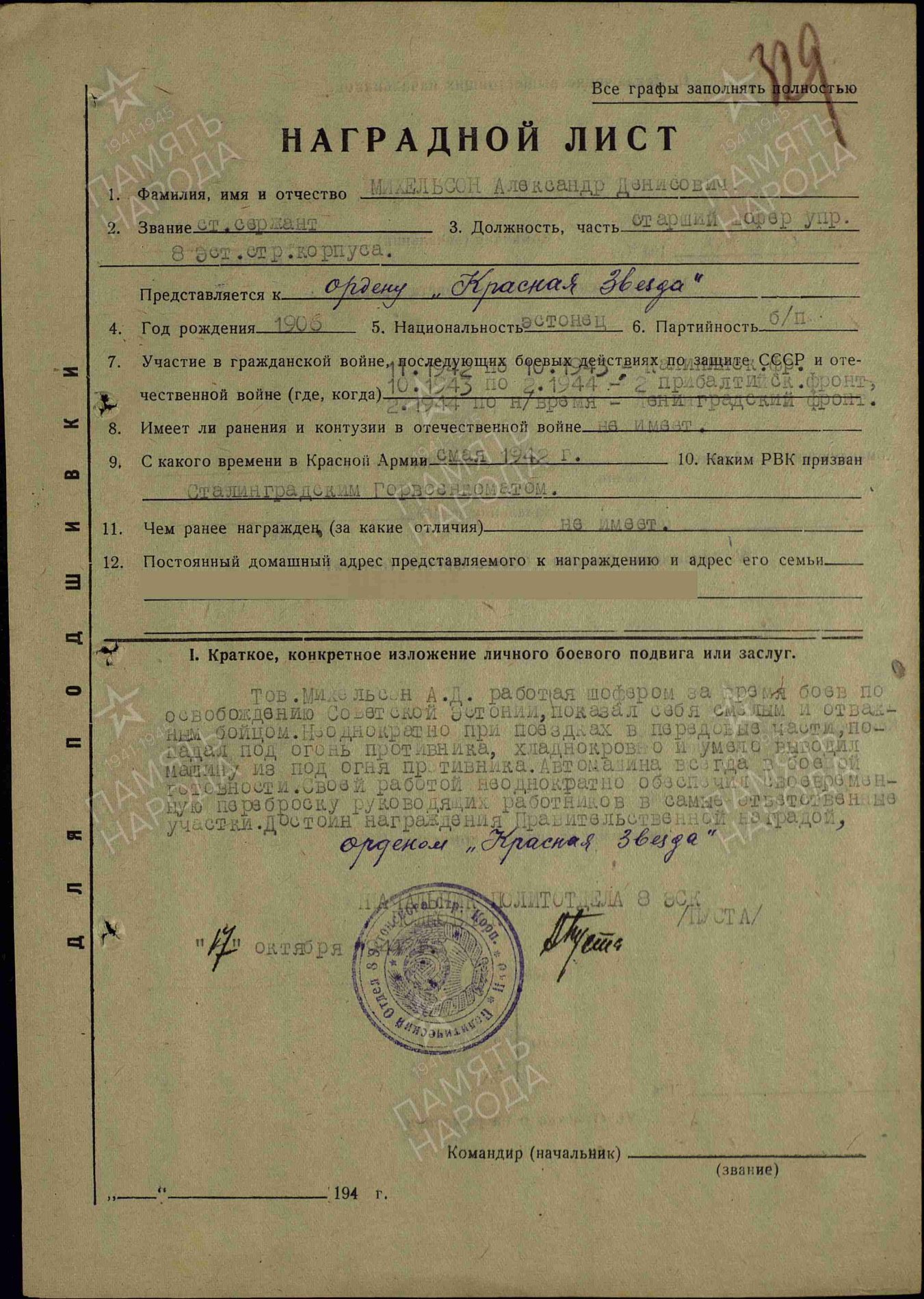 Kui Punatähe ordeni nr. 939477 kavaleriks on 8. Eesti Laskurkorpuse poliitosakonna autojuht, vanemseersant Leopold Karu, siis Punatähe ordeni nr. 939478 kavaleriks on 8. Eesti laskurkorpuse juhtkonna vanemautojuht, vanemseersant Aleksander Mihelson. Mihelson on autasustatud ka Lahinguteenete medaliga nr. 2046415tossom kirjutas: ↑N Mär 25, 2021 11:09 am Ka Punatähe orden nr. 939477 on siin teemas olnud varem, kuid nüüd on autasustatu teada. Selleks on vanemseersant Leopold Karu, 8. Eesti Laskurkorpuse poliitosakonna autojuht.
