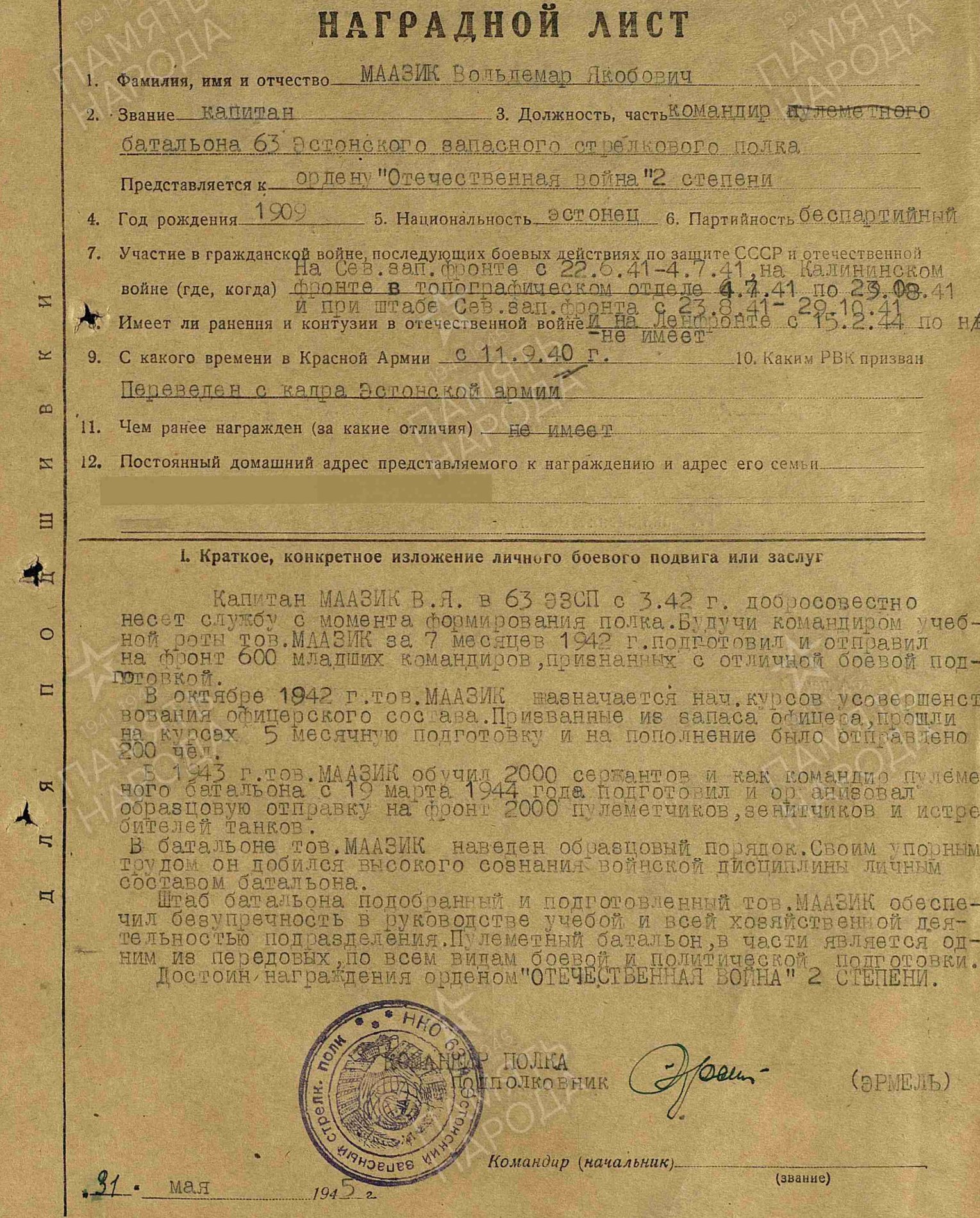 Kapten Maasik V.J. on 63. üksiku laskurpolgu teenistuses alates 1942. aasta märtsist ning täidab oma kohustusi kohusetundlikult alates polgu moodustamisest. Õpperoodu komandörina koolitas ja saatis rindele 7 kuu jooksul 1942. aastal üle 600 nooremkomandöri, keda hinnati väga heaks lahinguettevalmistuse poolest.