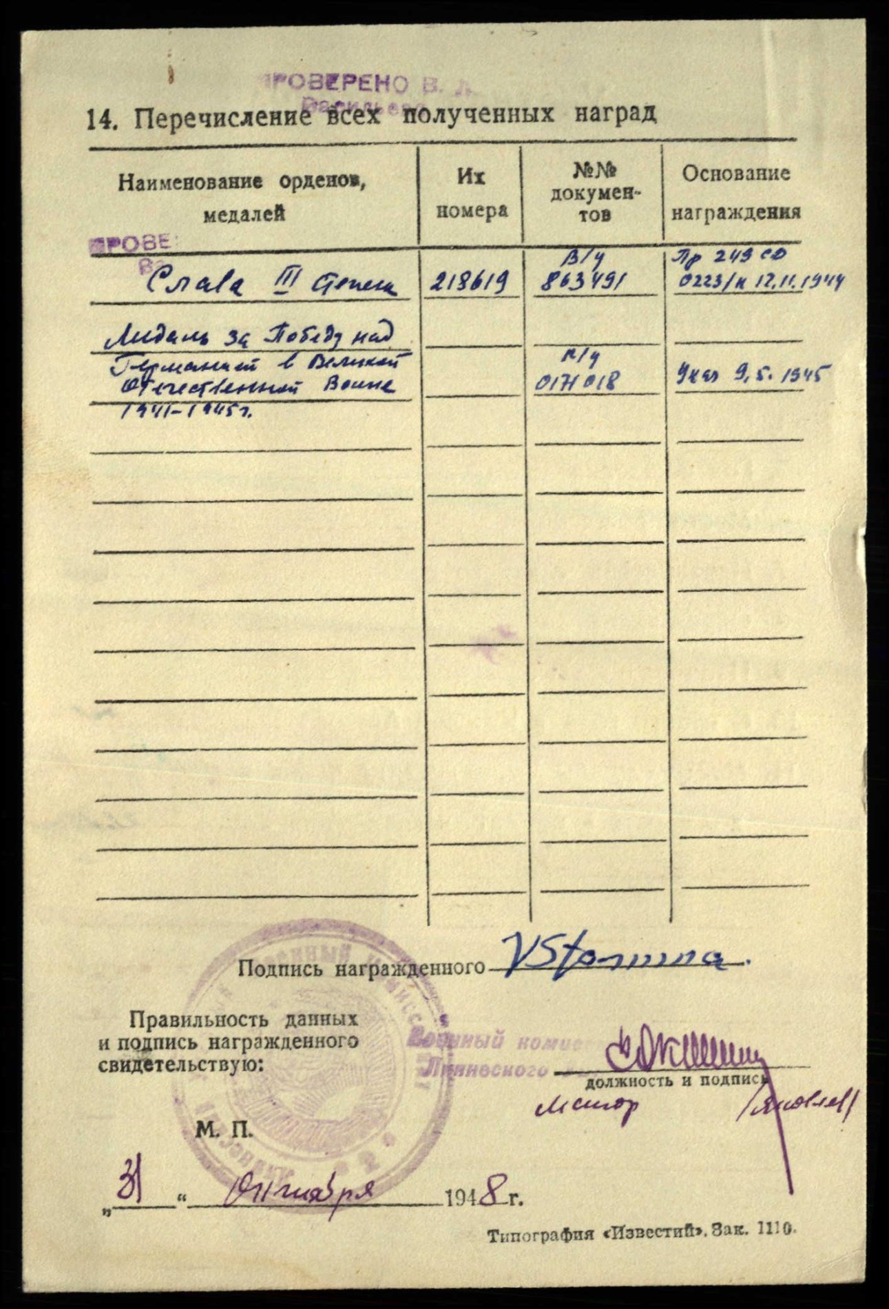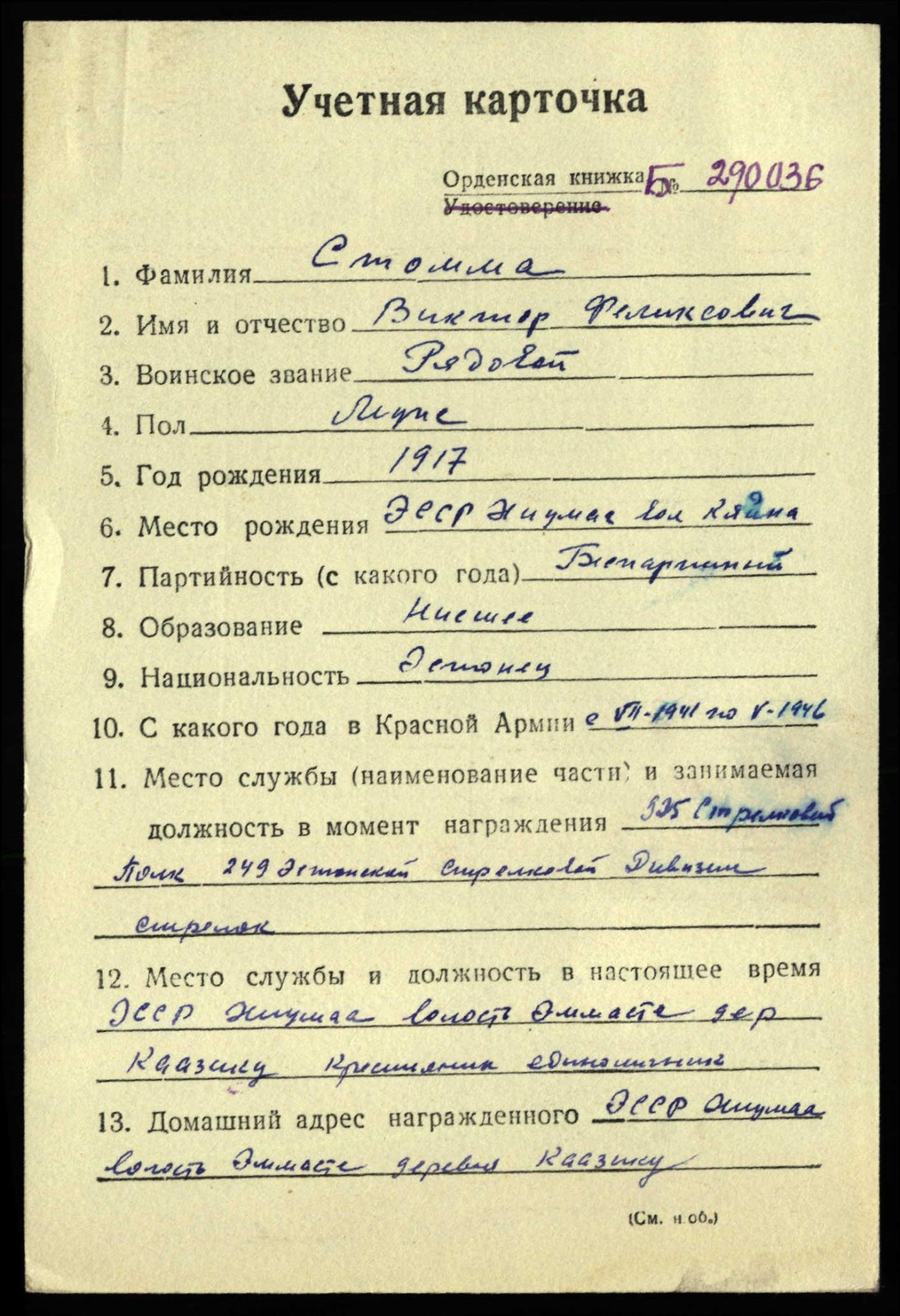 Saaremaa lahingud jah. Kavaleriks 249.Laskurdiviisi 779. suurtükiväepolgu 6. patarei punaarmeelane Viktor Stomma, III klassi Kuulsuse ordeni nr. 218619 kavaler.tossom kirjutas: ↑K Apr 24, 2019 3:55 pm Ja see III klassi Kuulsuse orden 218619 peaks olema seotud Saaremaa lahingutega. Teada on, et näiteks Kuulsuse III klassi ordeni nr. 218618 sai 1944.a sügisel Saaremaal Salme küla all telefonist Endel Ant. Kui nimekirja vaadata, siis temast järgmine on reamees Voldemar Baidak, kes sai Kuulsuse ordeni Sõrve sääre lahingute eest. Aga see ei pruugi muidugi nii olla, täpse vastuse annab ainult arhiiv.