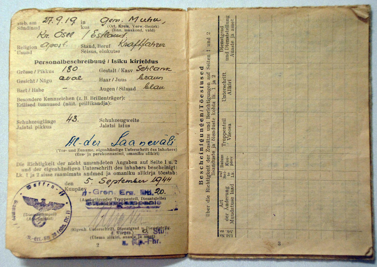 Palgaraamatu omanikust paar ilusat ülesvõtet.uscha kirjutas:... kakskeelne SB, mis väljastatud 20. SS tagavarapataljoni põhikompanii Unterscharführer Aleksander Laaneväli'le.